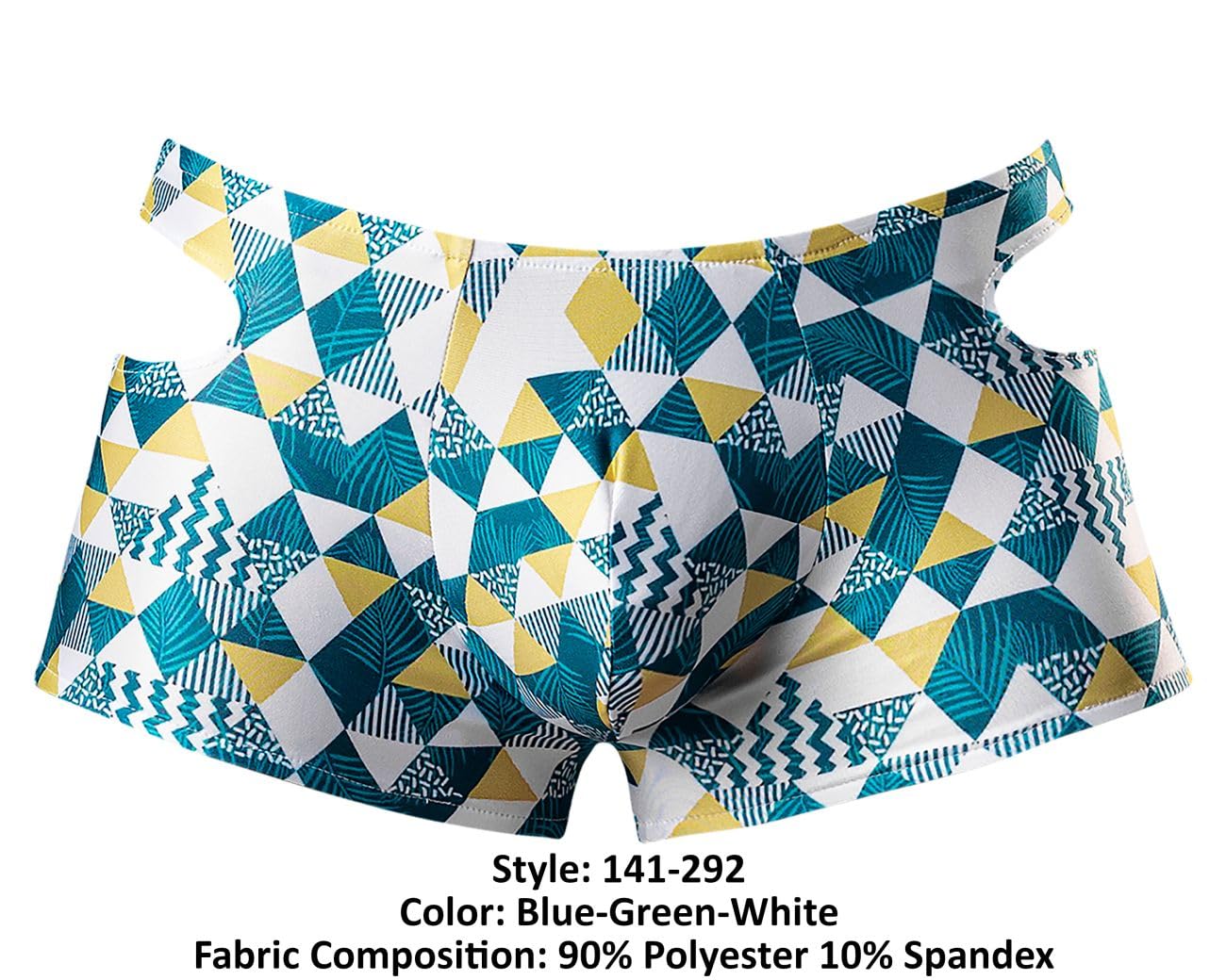 Q: What colors are available for the Male Power 141-292 Mini Short?A: The Male Power 141-292 Cut It Out Mini Short is available in a color combination of blue, green, and white.