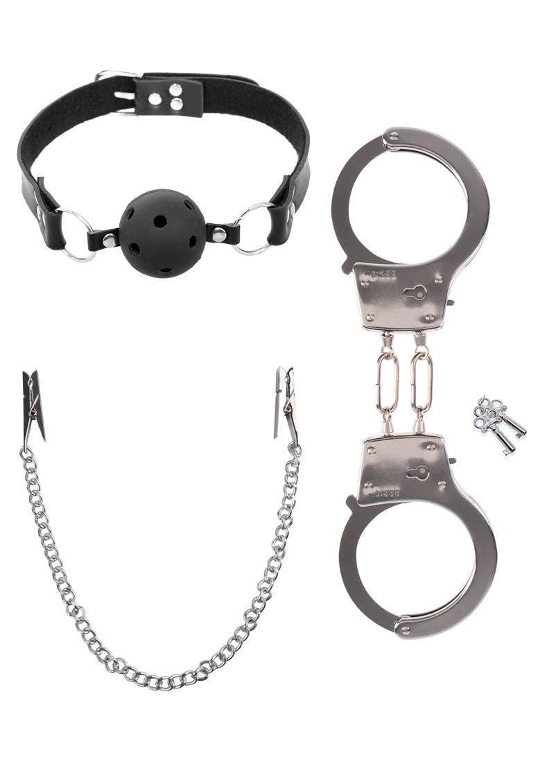 Q: What is included in the Pipedream Fetish Fantasy Shut Me Up Kit?