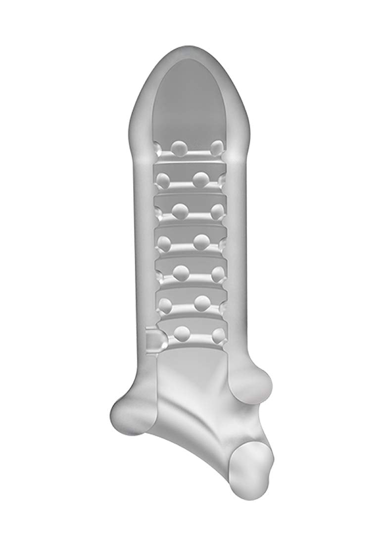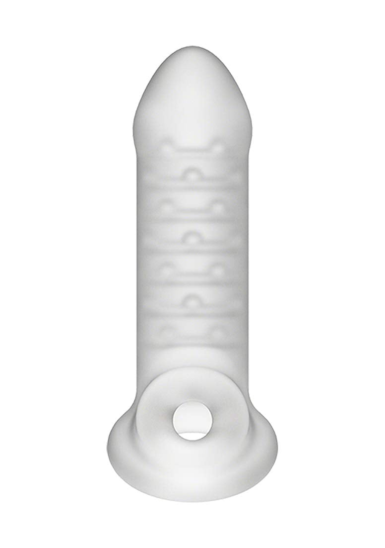 Q: What features make this extender unique?A: The extender features a ribbed, studded interior for stimulation, a ball strap for added pleasure, and a visually appealing sheer material.