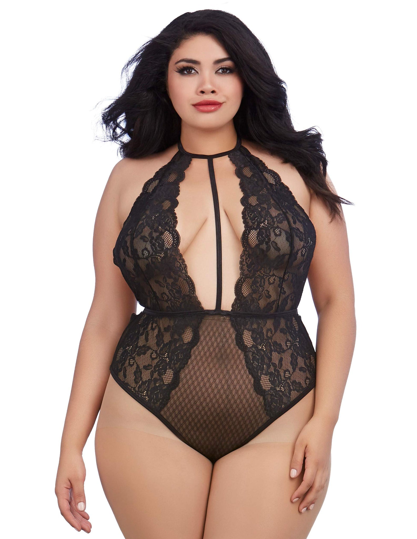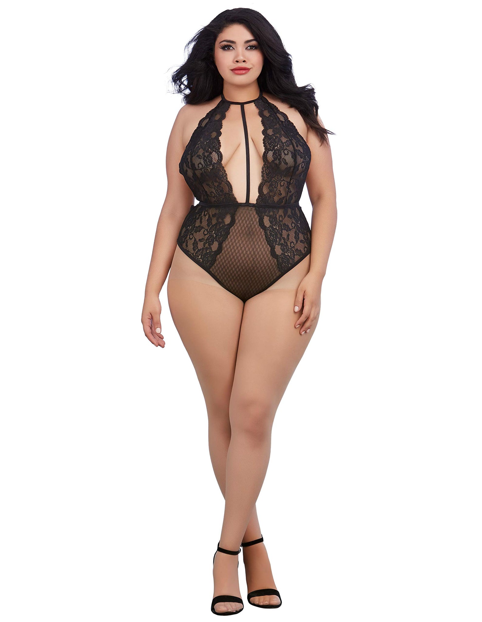 Plus-Sized Stretch Lace And Patterned Mesh Teddy. Plunge Front. Ties At Back Neck. Open Back Styling. Adjustable Waist Elastic. A Perfect Gift For Your Lover ,Delightfully Soft Cotton For Comfy Coverage.
