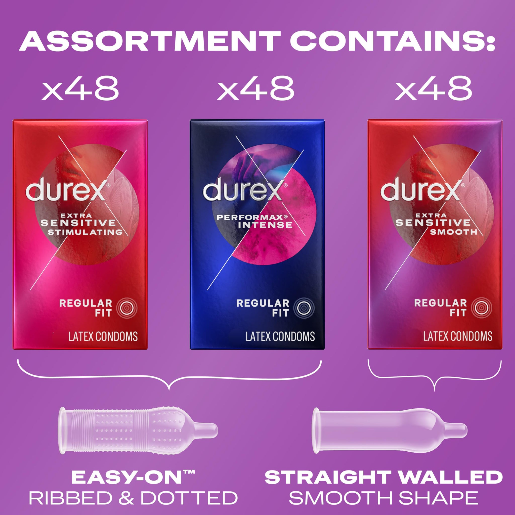 Q: What types of condoms are included in the Durex Adventure Pack?A: The Durex Adventure Pack includes three types of condoms: 48 Extra Sensitive Stimulating Ribbed Condoms, 48 Extra Sensitive Smooth Condoms, and 48 Performax Intense Ribbed Condoms.