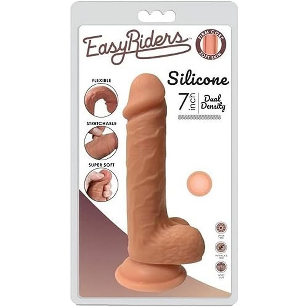 Easy Riders 7 inches Dual Density Silicone Dong with Balls from Curve Toys. Dual Density Silicone Dong features bendable, flexible, soft realistic dong. Phallic head and sculpted veins feel like the real thing. Strong suction cup sticks to any flat surfac