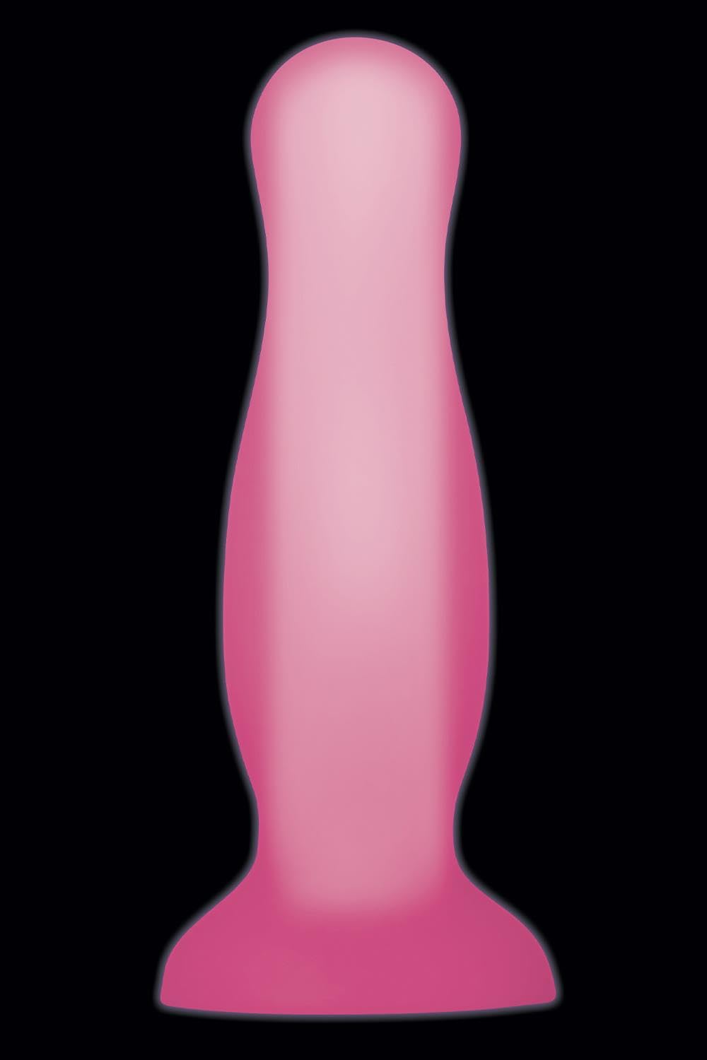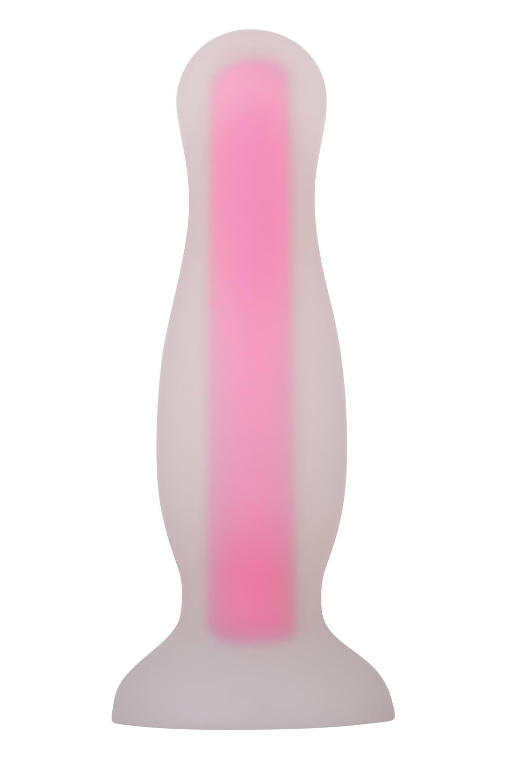 Luminous Plug Small from Evolved Novelties. Soft, squishy small glow in the dark butt plug. Flexible bowling pin shape for titillating insertion. Made from body safe smooth silicone. Dual layered for cushioned feel. Pink inner layer glows in the dark. Cle