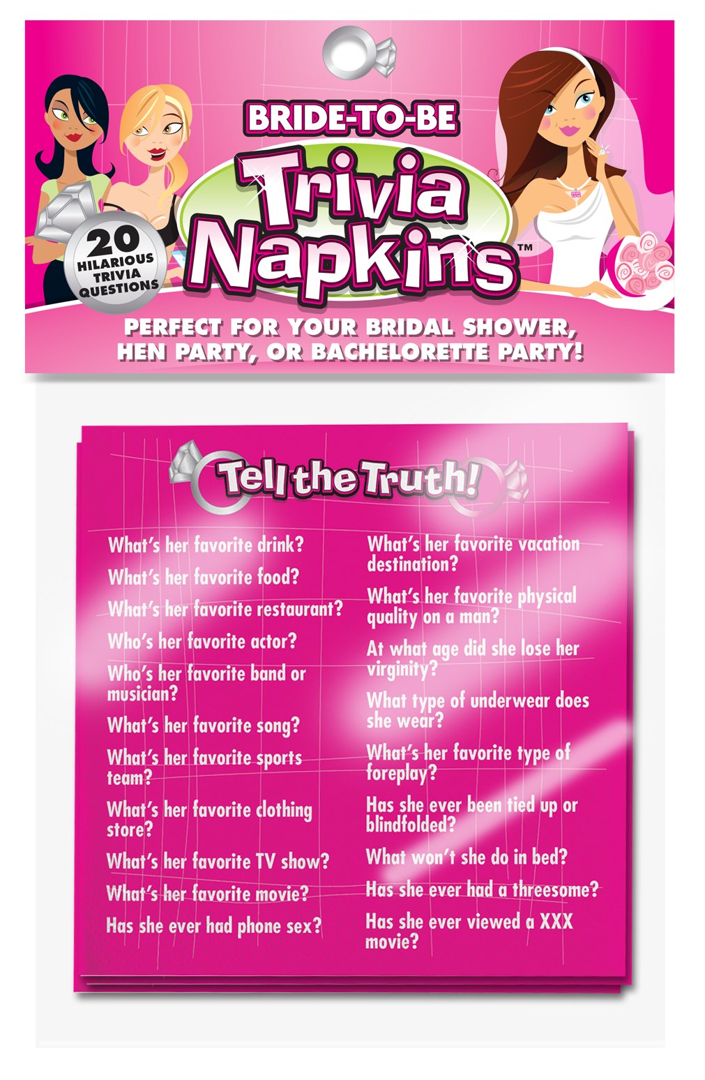 Q: What are the Bride-to-be Trivia Napkins?A: The Bride-to-be Trivia Napkins are a fun party accessory that challenge guests with 20 humorous trivia questions about the bride, perfect for bridal showers or bachelorette parties.