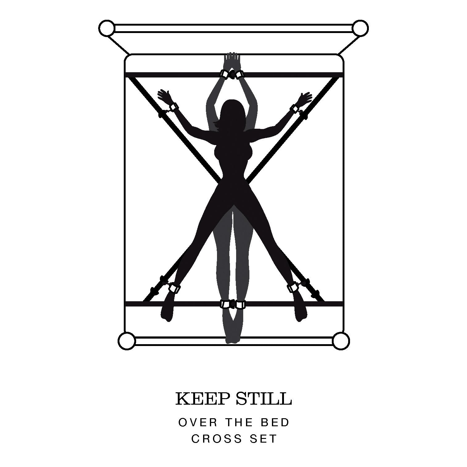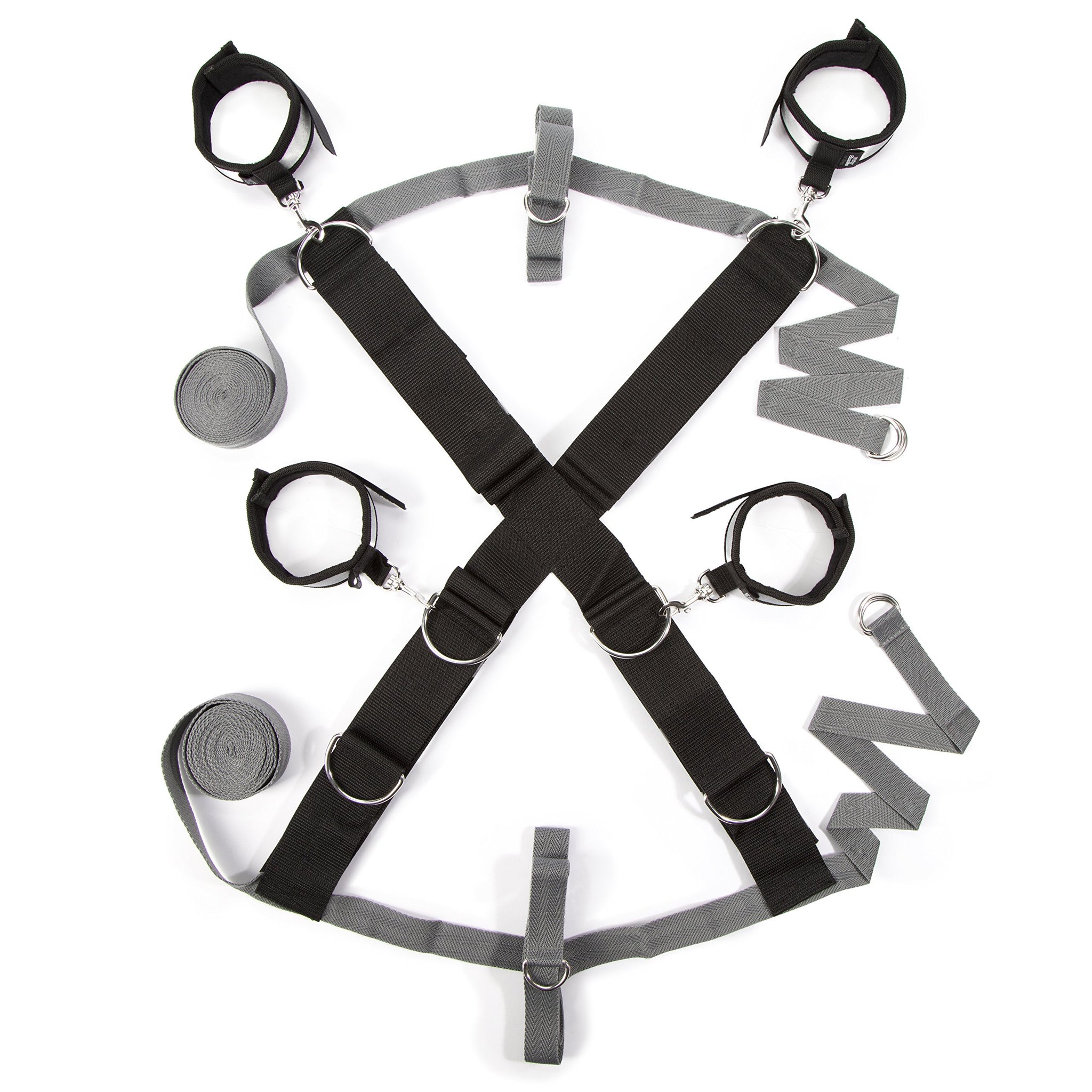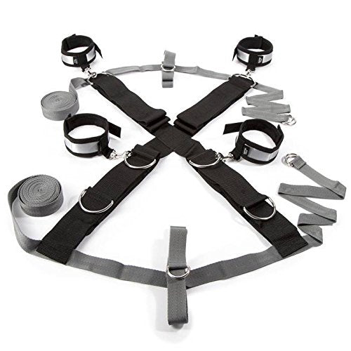 Q: What is included in the Fifty Shades of Grey Keep Still Restraint Kit?A: The kit includes an over-the-bed cross restraint system with detachable faux-fur lined wrist and ankle cuffs, a blindfold, and a door hanger.