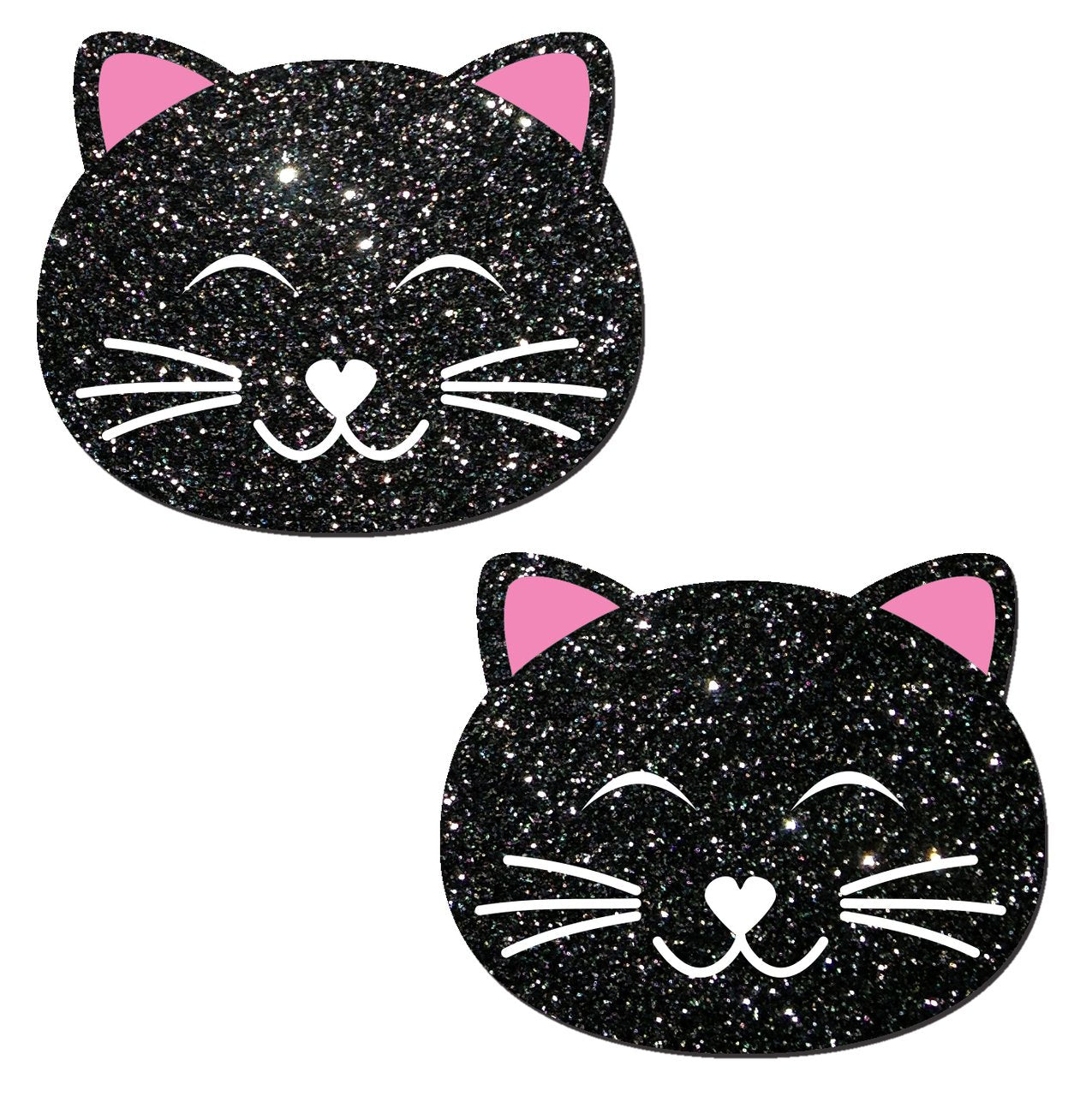 Happy Kitty Cat Nipple Pasties in Black Glitter by Pastease are hand made in the USA of durable, no-mess glitter pleather material that forms to curves and resists wrinkling over hardening nipples. Just peel and stick on clean, dry skin! All Pastease fea