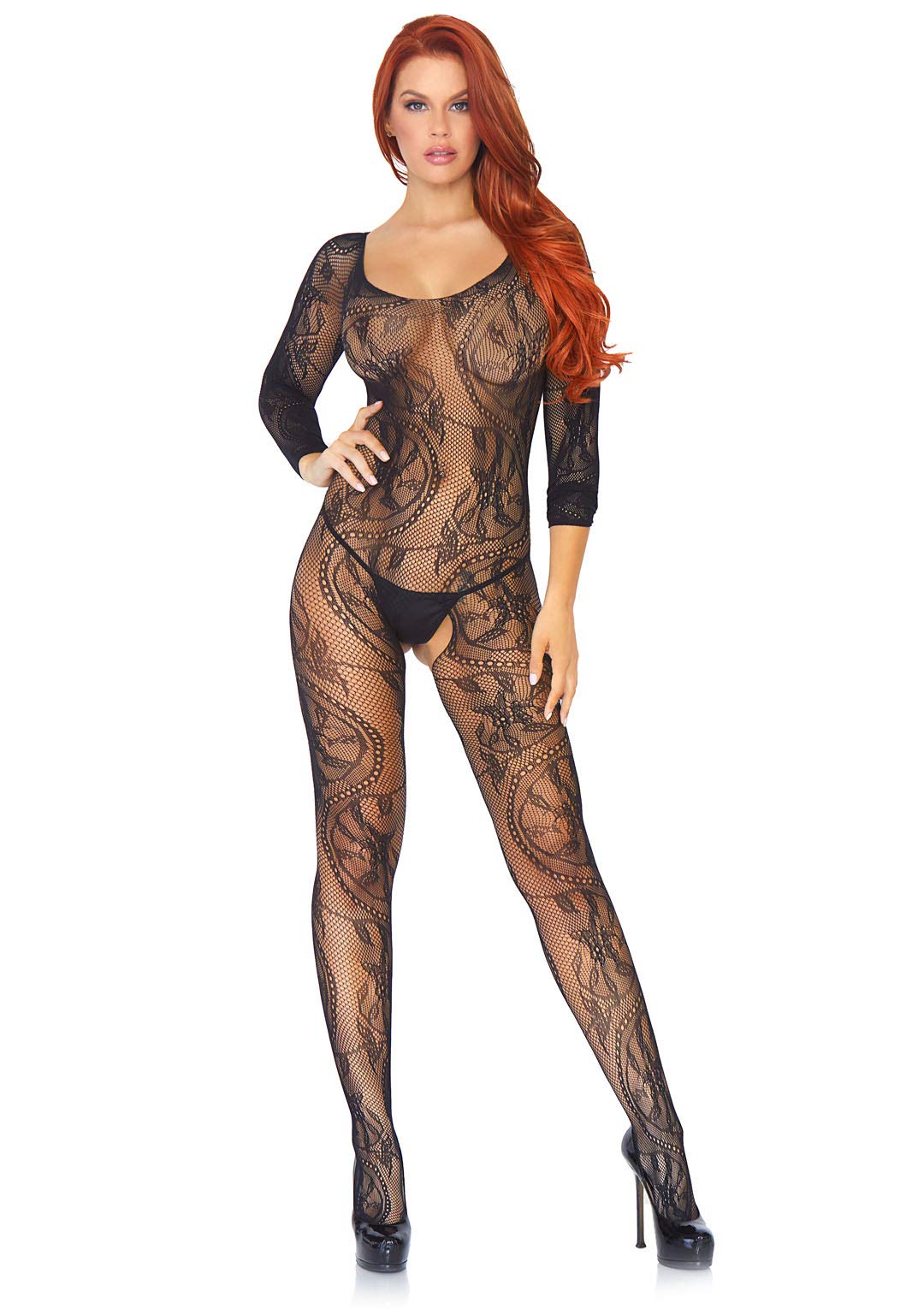Q: What sizes does the Leg Avenue Women's Bodystocking come in?A: The Leg Avenue Women's One Size Seamless Swirl Lace Long Sleeved Crotchless Bodystocking is designed to fit a variety of body types, accommodating most sizes comfortably.