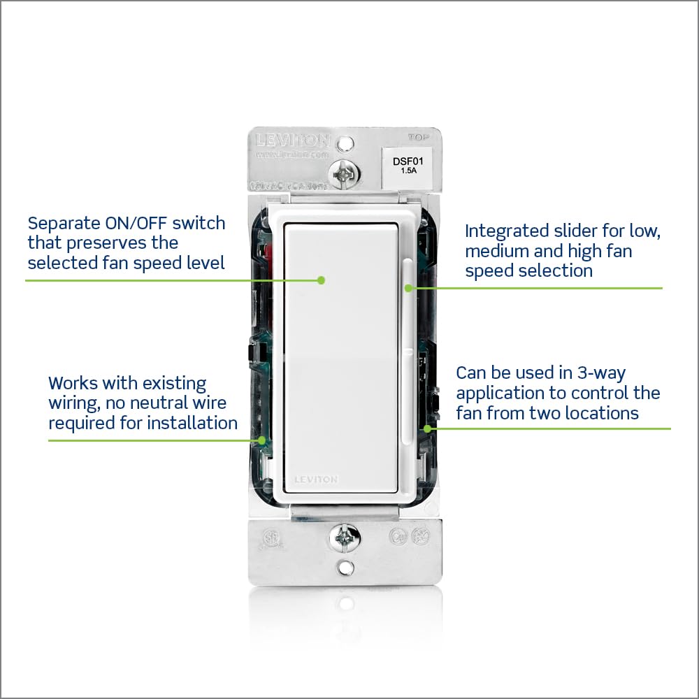 Forget the pull chain! Use a fan speed control switch for your ceiling fan. The Leviton Decora Slide Fan Speed Control uses existing wiring, and a neutral wire is not required for installation. Enjoy quiet operation with an integrated slider for 3-fan speeds and a separate on/off switch that preserves your selected fan speed setting. Change the color at any time using the Decora Slide faceplate DSKIT-0N (sold separately), available in 7 popular colors. Ideal for use in bedrooms, home offices, living rooms, and any area where ceiling fan noise could become distracting.
