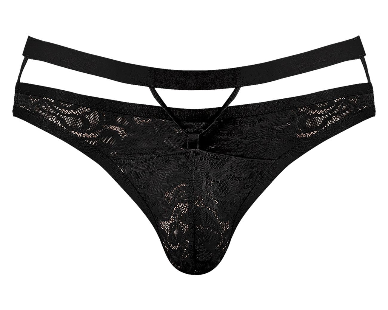 Q: What is the style of the Male Power 446-289 Lucifer Cut Out Strappy Thong?A: The Male Power 446-289 Lucifer Cut Out Strappy Thong features a vintage-inspired design with a soft stretch lace and a curlycue floral pattern, offering a gothic aesthetic.