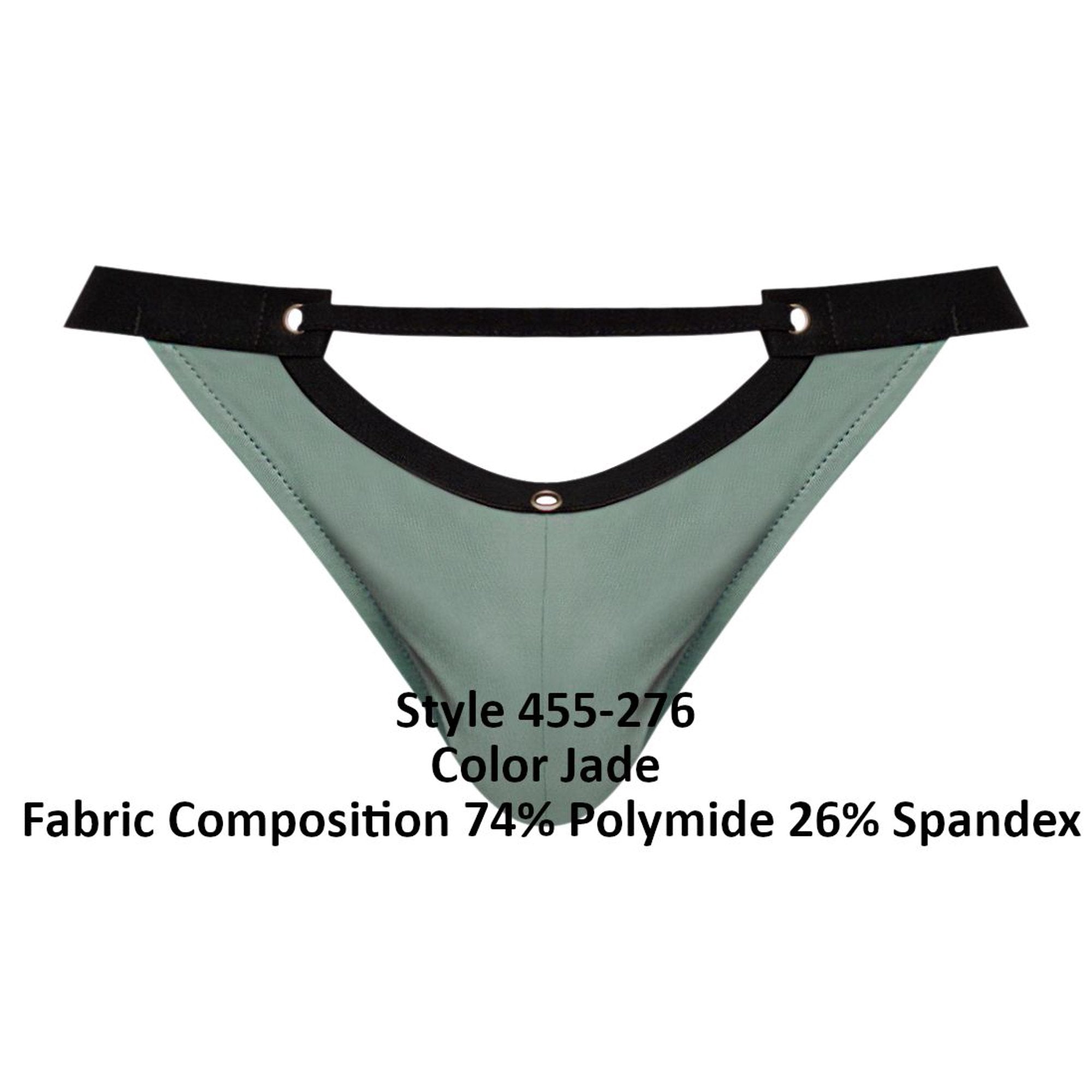 Q: What features does the 455-276 Magnificence Micro V Thong have?A: This style includes a cutout window on the waist, decorative metal grommets, and a slim stay-put plush elastic waistband with a V-shaped fabric insert in the T-back.