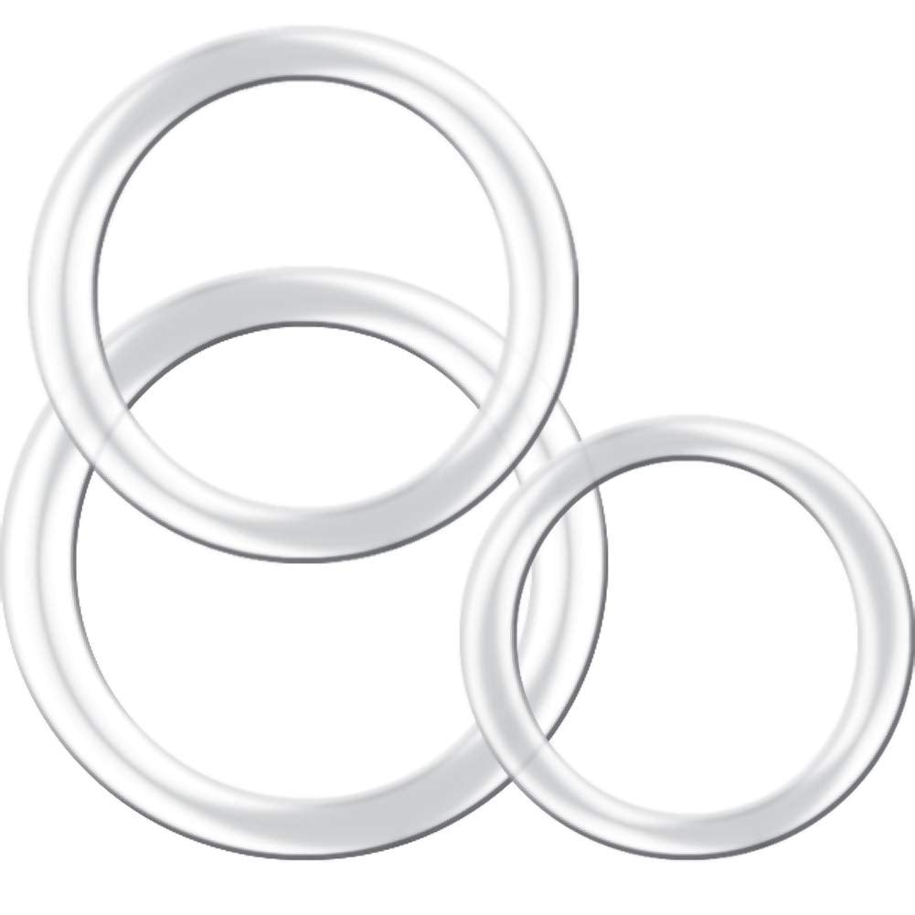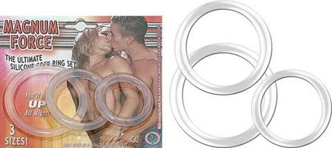 Magnum Force Clear Cock Ring Set from Nasstoys of NY. The ultimate Silicone cock ring trio set with small, medium and large will keep you up all night. Water based personal lubricant is recommended. Cock rings when worn around the base of the penis and te