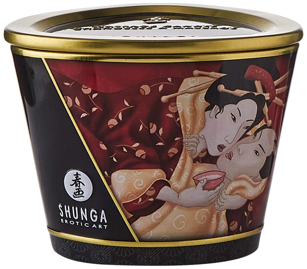 Q: What is the scent of the Shunga Massage Candle?A: The scent of the Shunga Massage Candle is Sparkling Strawberry Wine, offering a sweet and fruity aroma.