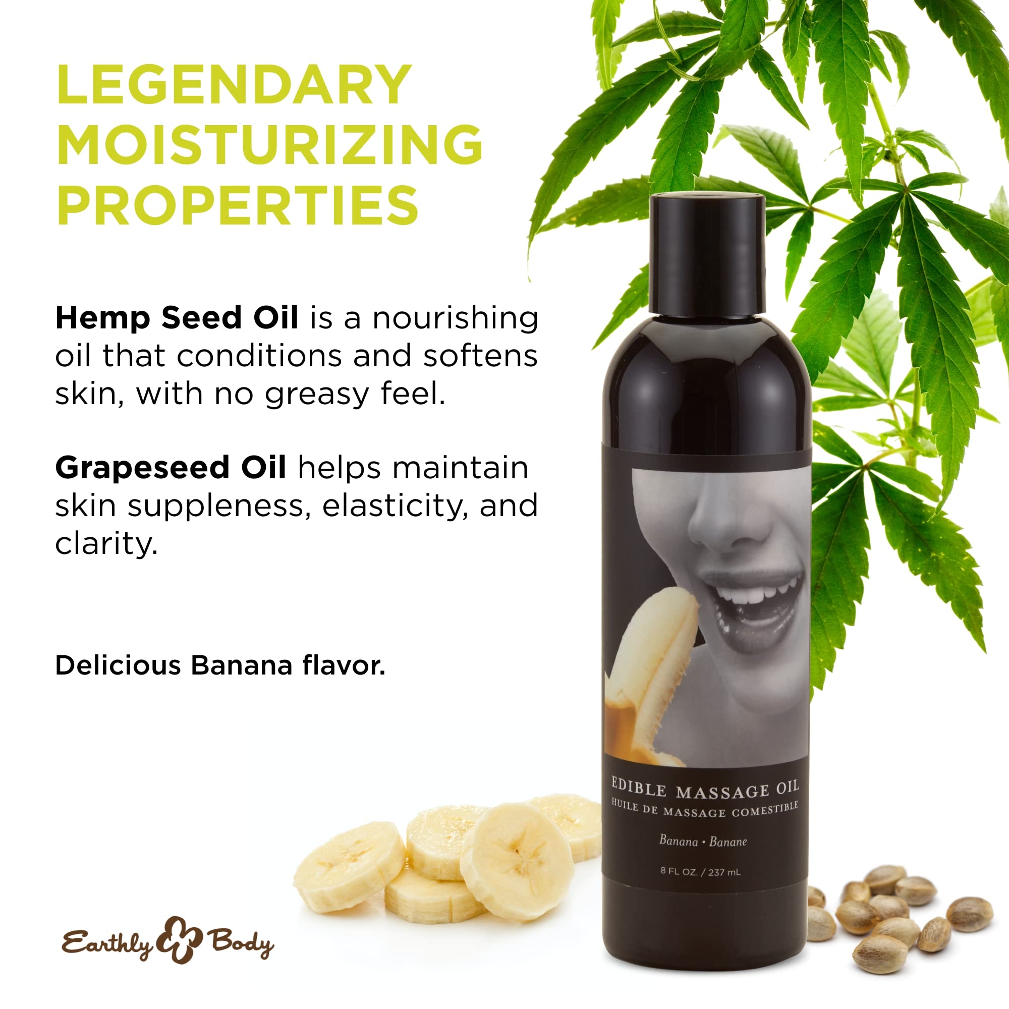 Q: What is Earthly Body Edible Massage Oil made of?A: Earthly Body Edible Massage Oil is formulated with natural oils including hemp seed oil, almond oil, grapeseed oil, apricot oil, and vitamin E oil, ensuring a vegan and cruelty-free product.