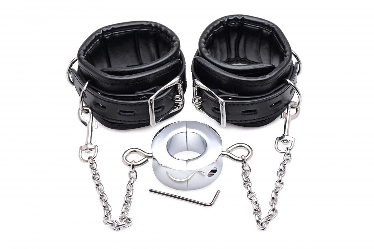 A: The ankle cuffs can be adjusted to fit circumferences from 8.5 inches to 13 inches. They include D-ring attachment points for additional restraints and locking buckles for added security.