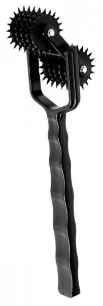Experience a light side of BDSM with a unique pinwheel with 10 rows of sensation spikes! Dual wheels spin 360 degrees, allowing you to feel every pinprick. Blindfold your lover and run this delightfully simple toy over the sensitive areas of their body. An easy-grip handle makes this tool feel like it is at home in your hand. Send shivers from head to toe with this unique instrument for teasing the senses. Measurements: 7.5 inches in length. 2.5 inches in width. Material: ABS.