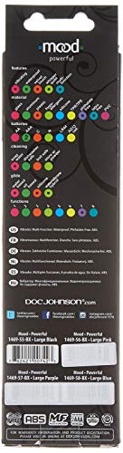 Mood Powerful Large Vibrator is available in four colors: Blue, Purple, Pink and Black. Each sold separately. Modern colorful Mood Packaging. Feeling playful? These vibrators feature psychedelic artwork. Then this is the push button massager you will want every time. Specially designed to give you a little bit of everything. Fall in love with the Mood Powerful 7 Function Vibrators are slim, compact, and sleek, but do not let their size fool you! They definitely pack a punch with strong vibrations that will take you to orgasmic ecstasy in no time! The smoky, swirled design and fun colors only add to the allure of these travel friendly vibes. And do not worry, the only noise you will hear while you use them is your own moaning these vibes are whisper quiet! 7 multiple function, waterproof, phthalate-free and latex-free, and easy to clean. Push-Button Control, hold for 2 seconds to turn off. Large Mood Vibrator measures 5 inches long by .7 inch wide. Vibrating sex toy requires 2 AAA batteries, not included. Always clean before and after use with Doc Johnson Antibacterial Toy Cleaner or with warm water and antibacterial soap. Dry thoroughly before storing. Mood Powerful Vibrator from Doc Johnson the Great American Toy Company.