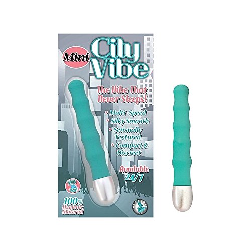 The vibe that never sleeps. Available 24/7. Mini City Turquoise Vibe. The City Vibe's thrilling vibrations will add lots of excitement to your life. 4 inches slim ridged smoothie-vibe with dual insertable vibrating tips. The shaft curves in and out throughout, and is waterproof for fun in or out of the water. Compact and discreet which also makes it great for travel. Made using phthalate free, non-toxic materials ABS plastic. Vibrating sex toy requires 1 AA battery, not included. Do not leave battery in the vibrator between uses. Discreet non graphic packaging. Always clean before and after use. Classic plastic vibrator. Mini City Vibe from Nasstoys of New York.