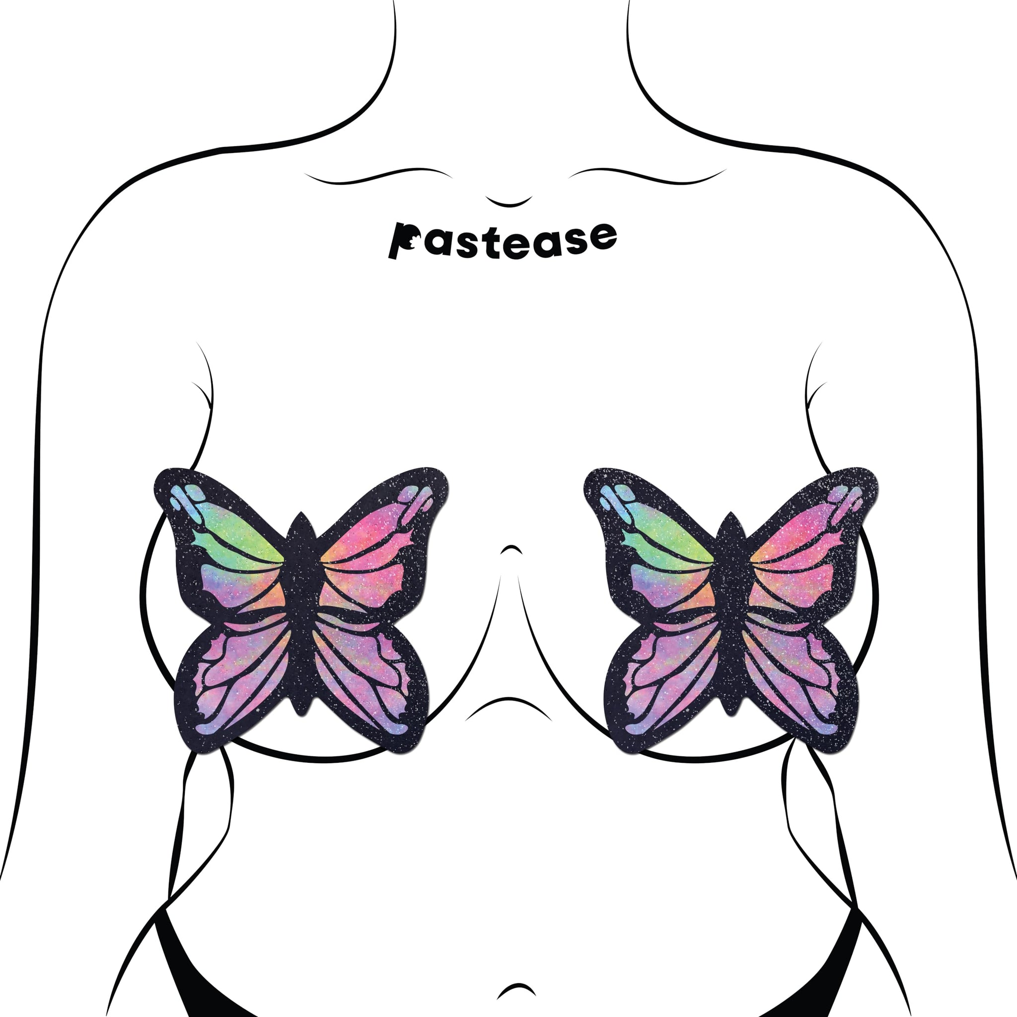 Pastease Butterfly Rainbow Twinkle Fuller Coverage Pasties. Coverage: Butterfly Rainbow Twinkle Velvet Full Breast Covers Support Tape by Pastease.For the larger busted, the modest user, the lady looking for a lift and the woman tired of Kotex looking functional nipple covers. Coverage by Pastease offers maximum coverage while offering fashionable, playful yet functional designs. All the function with all the fun and with extra lift too, who does not want that? Size dimensions 4.7 inches wide by 4.5 inches tall. Coverage 2.5 inches. Easy to apply. Just peel and stick on clean, dry skin! All Pastease pasties feature latex free, medical grade, waterproof adhesive that stays securely in place for as long as you like and until they are gently removed. Improved lift and support. Larger busts often require additional lift and support, and that is exactly what Pastease's large coverage style pasties offer. You can enjoy a natural looking lift and feel secure throughout the day or night, no matter the occasion. Enhanced comfort and confidence.The larger coverage ensures that the pasties effectively cover a greater area, offering more support and minimizing the risk of any discomfort or wardrobe malfunctions. With our Coverage Line, you can confidently rock any outfit without worrying about unwanted exposure. Versatile styling options. Enhanced coverage allows for greater options when choosing your next outfit. Whether you are wearing a low cut dress, a backless top, or a plunging neckline, these pasties offer the confidence to wear any style with ease. Safe for skin. All Pastease adhesive products are latex free and leave the skin with no signs of irritation upon removal. Medical grade materials. At Pastease products are hand made, in house, with love while using the highest grade materials. Waterproof. Pastease brand pasties are waterproof and sweat resistant, keeping you worry free for any occasion. Categories: Lingerie, Clothing, Sexy Costume Accessories, Plus Size, Pasties and Accessories, Holiday Items. 2023 Catalog.