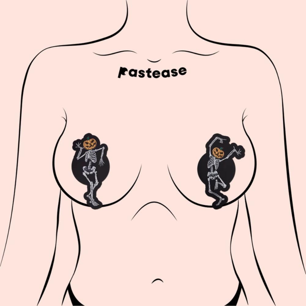 Pastease Dancing Skeletons with Pumpkin Heads! Dancing Skeletons Pasties with Pumpkin Heads Spooky Scary Skeletons Pastease Brand. Introducing the spook tacularly delightful Dancing Skeletons Pastease. Your ultimate Halloween breast accessories that bring playful enchantment to your fall festivities! Crafted with unparalleled attention to detail, these Pastease are adorned with mischievous dancing skeletons, each sporting a Jack-O-Lantern head for an irresistible blend of eerie charm and whimsy. Created from a premium blend of soft and form fitting poly materials, guaranteeing a comfortable fit that does not compromise on style. Whether you are planning to don a bewitching costume, attending a spirited Halloween soire, or simply looking to embrace the autumnal vibe, these Pastease are your go to accessory. But the magic does not stop there! We understand the importance of skin friendly solutions, and that is why our Dancing Skeletons Pastease are thoughtfully backed with hypoallergenic medical grade adhesive. This ensures that even those with sensitive skin can revel in the fun without any worries. The adhesive guarantees a secure hold, letting you dance the night away, mingle with friends, and capture picture perfect memories with confidence. Whether you are embracing the Halloween spirit or celebrating the cozy aura of fall, the Dancing Skeletons Pastease are the ultimate expression of festive fashion. Step into the world of playful Skeletons and Jack-O-Lantern charm. Order your Dancing Skeletons Pastease today and join us in celebrating a season of spook-tacular style and unbridled fun! Size 2.5 inches by 4 inches. Coverage 2 inches. Whimsical design. Playful dancing skeletons with Jack-O-Lantern heads bring a delightful touch of enchantment, making these Pastease the perfect Halloween and fall accessory. Comfortable fit. Crafted from a soft and form fitting Polyester blend, these Pastease effortlessly conform to your curves, ensuring all night comfort without compromising on style. Hypoallergenic adhesive. Backed by hypoallergenic medical grade adhesive, these Pastease are gentle on even the most sensitive skin, providing a secure hold for worry free dancing, festivities and daily wear. Versatile wear. Ideal for costumes, parties, or simply embracing the fall season, these breast accessories let you express your individuality while adding a touch of spooky fun to any occasion. Secure hold. The strong adhesive ensures that these Pastease stay in place throughout your activities, without distracting adjustments. Removes easily at the end of use. Directions for how to apply Pasties: peel off backing from one side of refill square. Stick your used Pastease Coverage onto the refill. Carefully cut away excess adhesive to match the contours of the shape. Make sure nipples and breasts are dry and free of lotions and oils. Peel off backing and apply included nipple pads or single ply tissue no larger than 1.5 inches to the center for piercings or sensitive nipples. Apply once and smooth down edges. Re-celebrate with confidence! Gently remove. Use lotion as needed. Categories for Dacing Skeletons: Lingerie, Clothing, Sexy Costume Accessories, Holiday items, Halloween Costumes, Risque Party Wear, Pasties and Accessories. Restricted, Amazon Restricted. Happy Halloween! 2023.