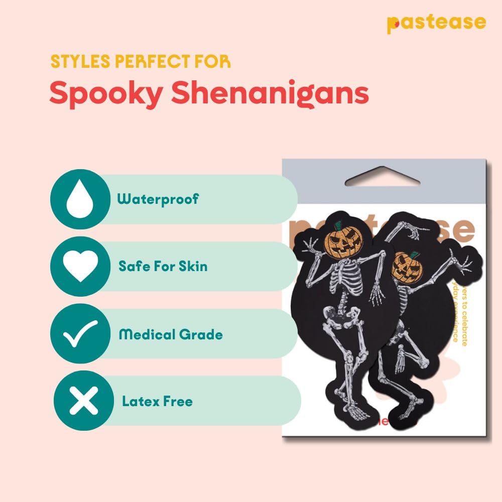 Q: Do these pasties come in different designs?A: Yes, Pastease Halloween Pasties are available in a variety of fun and festive designs, including the Dancing Skeletons with Pumpkin Heads.