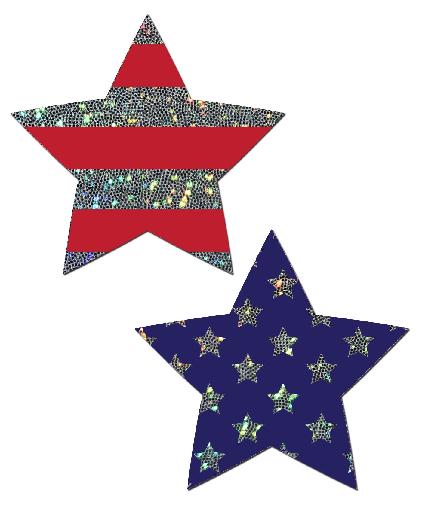 Pastease Rockstar Stars and Stripes Pasties hand made in the USA. Serious about sexy fun freedom! Medical grade. Waterproof. Latex free, skin safe adhesive that stay securely in place for as long as you like and until they are gently removed. Conceal or r
