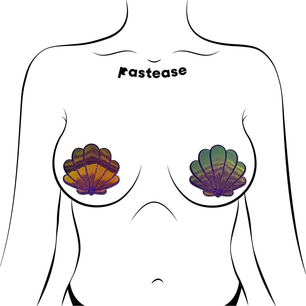 Introducing our Mermaid Shells Pasties in Opalescent Purple & Gold Seashell by Pastease ?the ultimate accessory for beach lovers and mermaid enthusiasts alike! Crafted from a luxurious blend of glitter purple with a stunning opalescent gold and seafood green film overlay, these pasties bring a touch of whimsical charm to your summer wardrobe.
