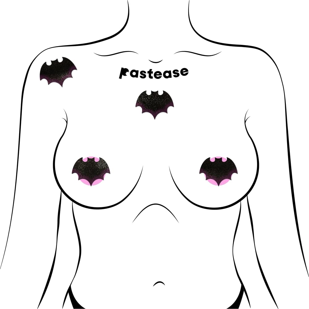 Pastease Small Liquid Bats. Petites: Two Pairs Small Liquid Black Bat Nipple Pasties by Pastease. Dimensions: 2 inches by 1.5 inches. Coverage Diameter: 1 inch. Unveiling the Petite Bat Pastease - a captivating accessory that brings a touch of dark elegance to your Halloween ensembles and gothic chic style. Embrace the allure of the night with four petite bats to accessorize your look, accentuate your style or wear as pasties. Featuring a shiny, liquid black finish, perfectly crafted to set your look apart from the rest. Key features: Petite Bat Design: Four intricately crafted petite bats lend an enchanting and bewitching vibe to your style, ideal for Halloween celebrations and gothic chic looks. Shiny Liquid Black Textile. The glossy, liquid like black fabric exudes an air of sophistication, adding a mysterious shimmer to your ensemble. Comfortable and secure. The Pastease are designed to offer a snug and comfortable fit, ensuring they stay in place all day or all night long. For those who revel in the mystique of Halloween or embrace the gothic aesthetics year round, the Petite Bat Pastease are an absolute must have. These mesmerizing bat designs exude an aura of sophistication and fascination, allowing you to express your individuality with a touch of enigmatic charm. Made from premium materials, the shiny liquid black textile creates a mesmerizing effect, reflecting the surrounding light to add a mysterious gleam to your outfit. The intricately detailed petite bats enhance the overall allure, making these Pastease a captivating accent to your look. The Petite Bat Pastease can be effortlessly paired with a wide range of outfits, from sultry Halloween costumes to gothic inspired fashion. Be it a night out on the town, a themed party, or an evening of indulging in the mystical, these Pastease are the ultimate finishing touch to enhance your allure. Make a bold statement this Halloween or any time you feel like embracing your inner gothic vibe. Step into the shadows and embrace the magic of the night with these extraordinary Pastease! Categories: Holiday item, Halloween items, Lingerie, Clothing, Sexy Costume Accessories, Pasties and Accessories. Restricted, Amazon Restricted. 2023.