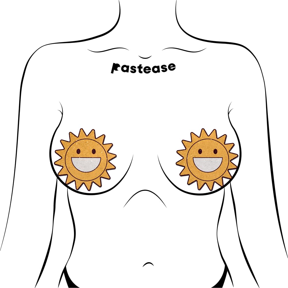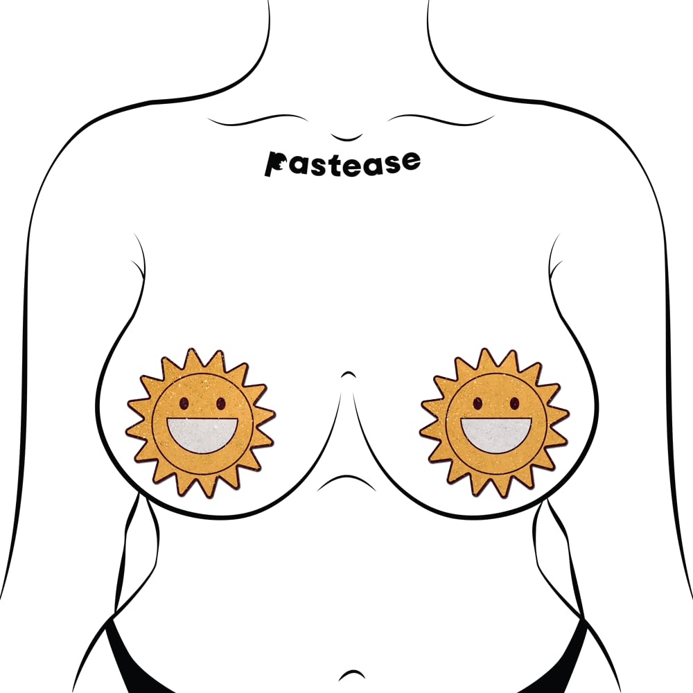 Introducing our Happy Sun Pasties - Sparkling Smiling Sunshine Nipple Covers by Pastease - the perfect accessory to brighten up your summer festivals! Crafted from luxurious glitter velvet material, these pasties offer both comfort and style.