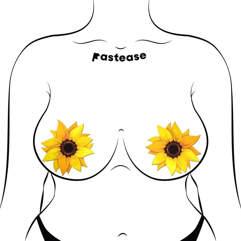 Sunflower Pasties Nipple Covers by Pastease. Elevate your style with our Sunflower Pasties Nipple Covers by Pastease, featuring a stunning gold sunflower design perfect for spring and summer. Made from a luxurious matte material, these pasties bring a touch of sunshine wherever you go. Here is why they are a must have. Luxurious Matte Material. Crafted from a soft and comfortable matte material for all day wear. Beautiful Gold Sunflower Design. Adorn your outfit with the beauty of a radiant gold sunflower, adding a touch of elegance and charm. Perfect for Spring and Summer. Embrace the spirit of warmer seasons with these sunflower pasties, perfect for adding a pop of color to your ensemble. Bring the Sunshine. Spread positivity and joy with your own personal sunshine, showcased in the form of these delightful sunflower pasties.Waterproof and sweatproof. Stay worry free in any weather with these waterproof and sweatproof pasties, ensuring long lasting comfort and style. Reusable with Pastease Refills. Sold separately. Enjoy the convenience of reusing these pasties up to 3 times with Pastease Refills, making them an eco-friendly choice for your wardrobe. Dimensions: 3.6 inches by 3.8 inches. Coverage: 2.5 inches. Brighten up your day and let your style bloom with our Sunflower Pasties! Categories: Lingerie, Clothing, Pasties and Accessories, Sexy Costume Accessories. 2024.
