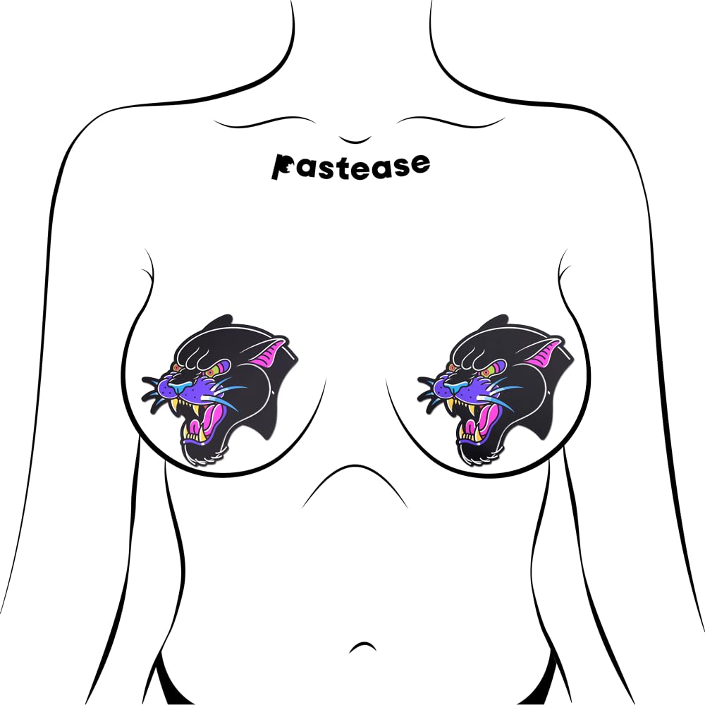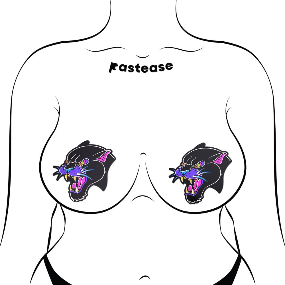 Black Panther Pasties Roaring Couger Tattoo Diamond Thom Nipple Covers by Pastease. Introducing the Black Panther Pasties Roaring Cougar Tattoo Diamond Thom Nipple Covers by Pastease: a fierce collaboration with the incredible tattoo artist Diamond Thom. Crafted on a soft to the touch luxe matte material, these pasties are a canvas of captivating artistry. Unleash your wild side with this unique design featuring: exclusive Diamond Thom Design. Immerse yourself in the captivating artistry of Diamond Thom, bringing you a roaring black panther adorned with hints of Purple, Pink, Blue and Green. Soft Luxe Matte Material. Experience ultimate comfort with our soft matte material, ensuring a feel as sleek as a panther's stride. Medical Grade Adhesive. Our pasties boast a latex free, hypoallergenic adhesive because bold statements should be fearless and irritation free. Waterproof and Sweat-Proof: Designed to withstand the elements, these pasties are both waterproof and sweat-proof, ensuring your fierce style lasts all night.Reusable with Pastease Refills: Extend the allure! These pasties are reusable up to 3 times with Pastease Refills, allowing you to showcase Diamond Thom's incredible design more than once.Dimensions: 3.6 inches by 3.5 inches. Coverage: 2.4 inches.Unleash the power of Diamond Thom's artistry and make a bold statement with Black Panther Pasties Roaring Cougar Tattoo ?where creativity meets untamed allure. Get ready to prowl the night and turn heads with every stride! Categories: Lingerie, Clothing, Pasties and Accessories, Sexy Costume Accessories. 2024.
