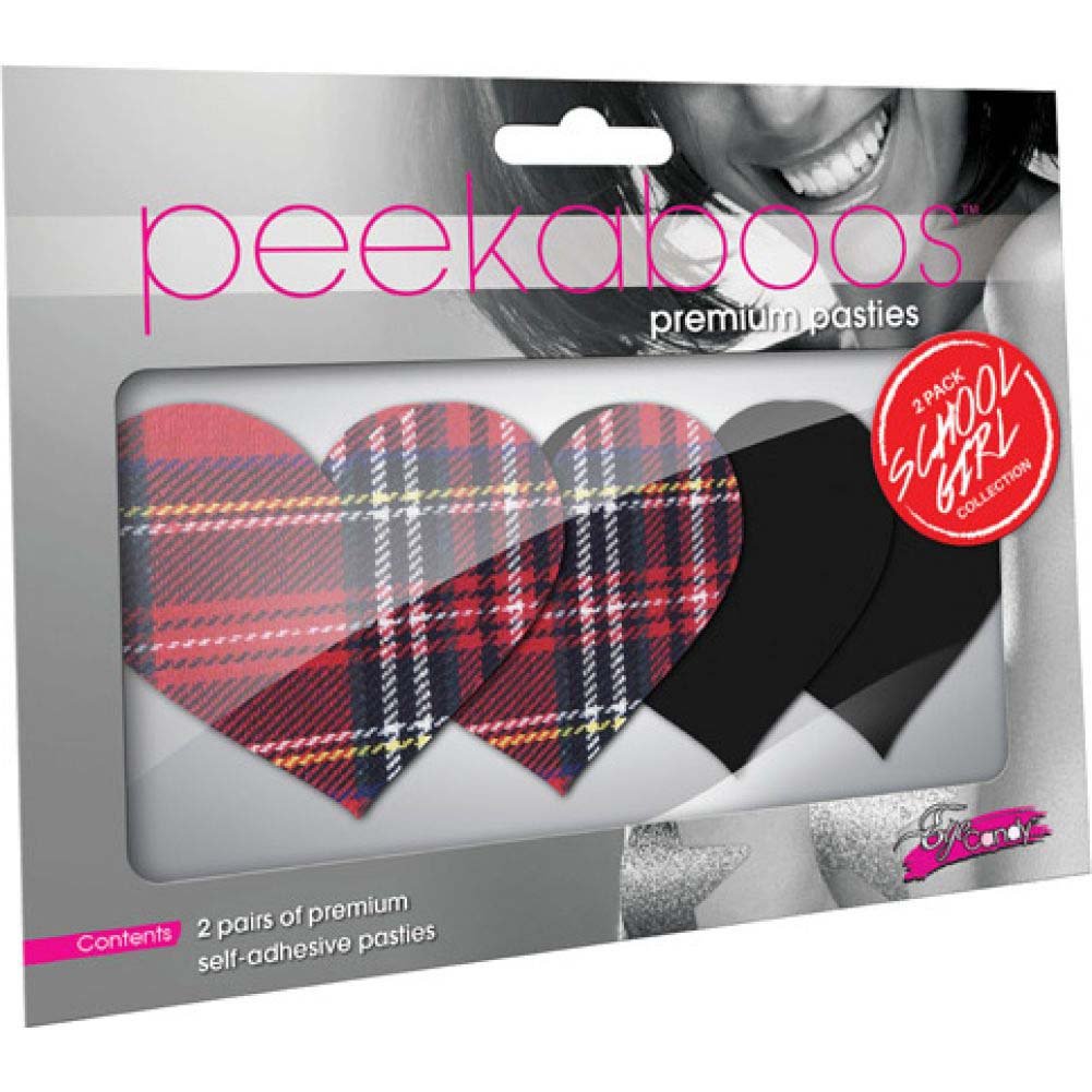 Peekaboo School Girl Hearts Pasties wear more revealing fashions! Cover up with style! Lasts as long as you do! Dance all night without even a slip! Fun as a flirty fashion add on, or just as premium pasties. Eye candy school girl collection. 2 pairs of p