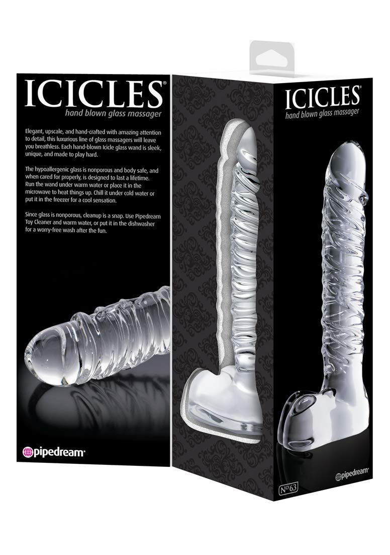 Q: What material is the Pipedream Icicles No 63 made from?A: The Pipedream Icicles No 63 is made from high-quality glass, ensuring durability and a luxurious feel.