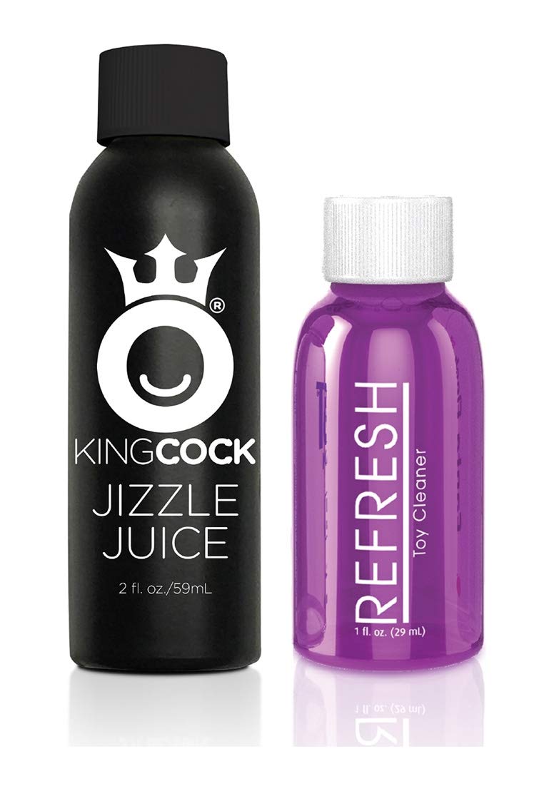Q: Does the King Cock Squirting Cock come with any accessories?A: Yes, the product includes a 2 fl. oz. bottle of Jizzle Juice and a 1 fl. oz. bottle of Refresh Toy Cleaner.