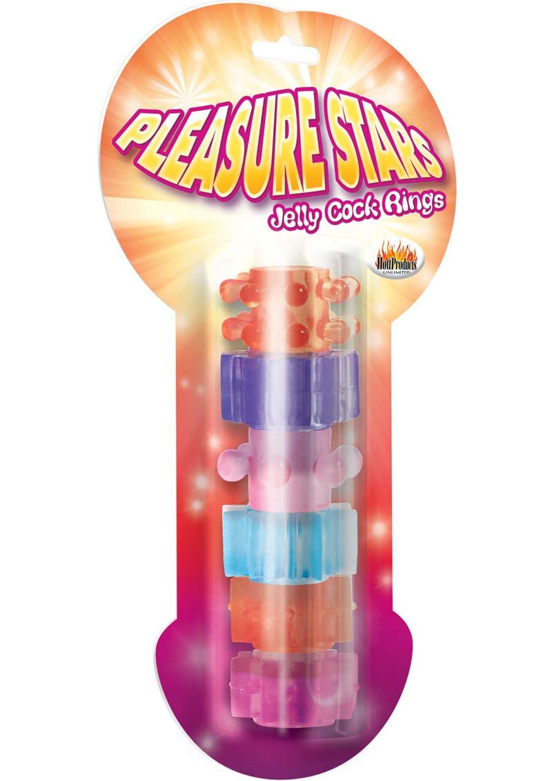 Pleasure Star Penis Rings from Hott Products. Ultra tight fit promotes longer lasting rock hard erections all night long for your next intimate encounter. Bumpy surface provides clitoral stimulation for your partner. Jelly Stars Cock Rings are the perfect