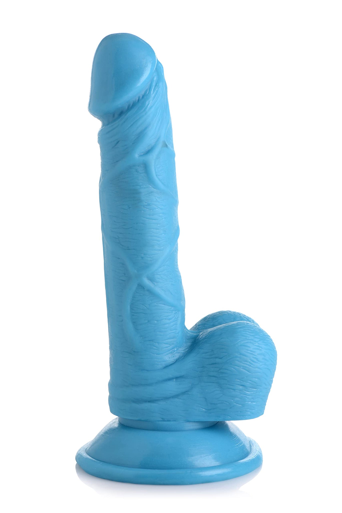 Pop 6.5 inches Dildo with Balls Blue from XR Brands. This popping colorful dildo is ready to be popped inside for your pleasure! Its veiny shaft and realistic balls are perfect for fantasy play! The suction cup base allows you to enjoy this toy hands free