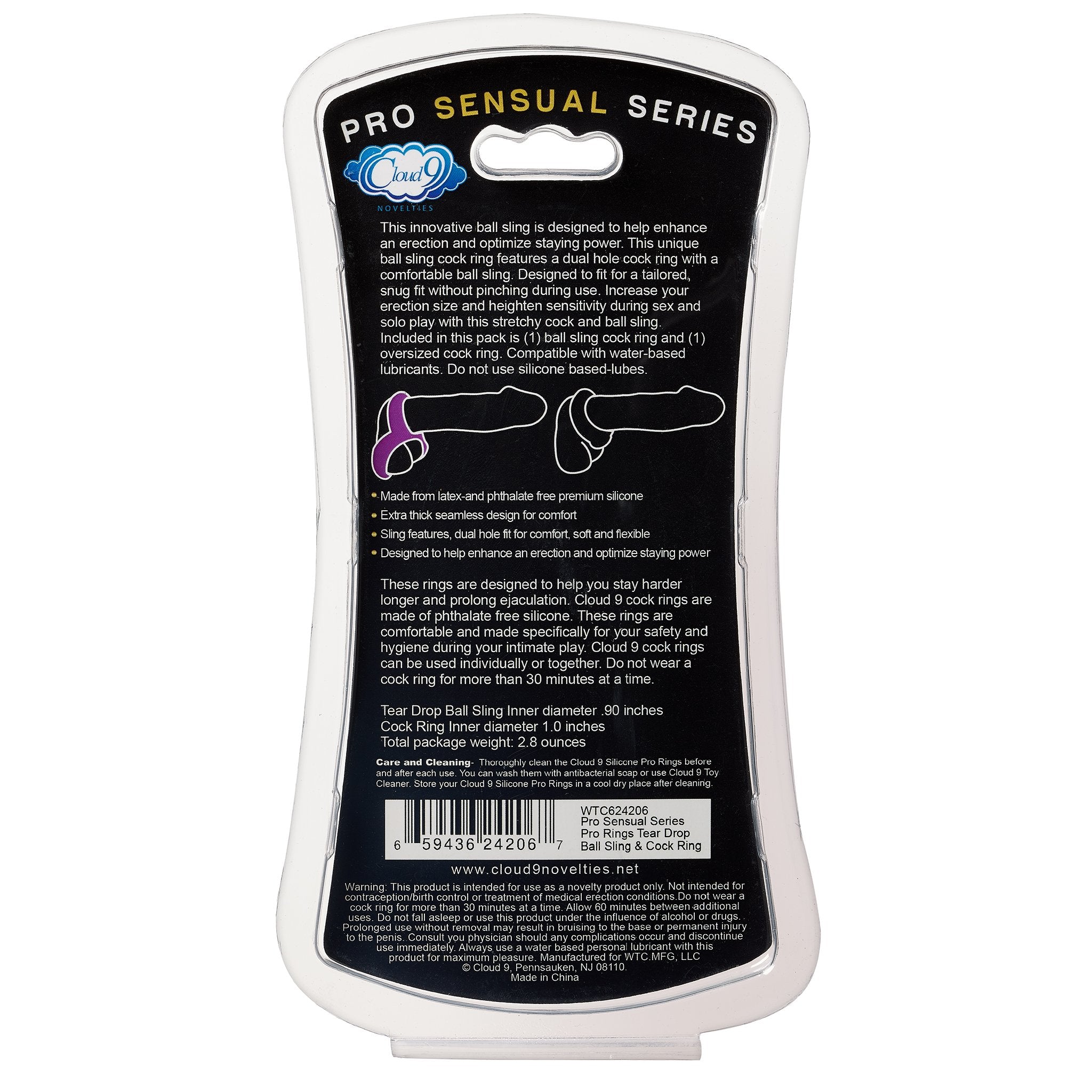 Pro Sensual Pro Rings Silicone Tear Drop Ring and Donut Sling 2 Pack from Cloud 9 Novelties. This innovative ball sling is designed to help enhance an erection and optimize staying power. This unique ball sling cock ring features a dual hole cock ring wit