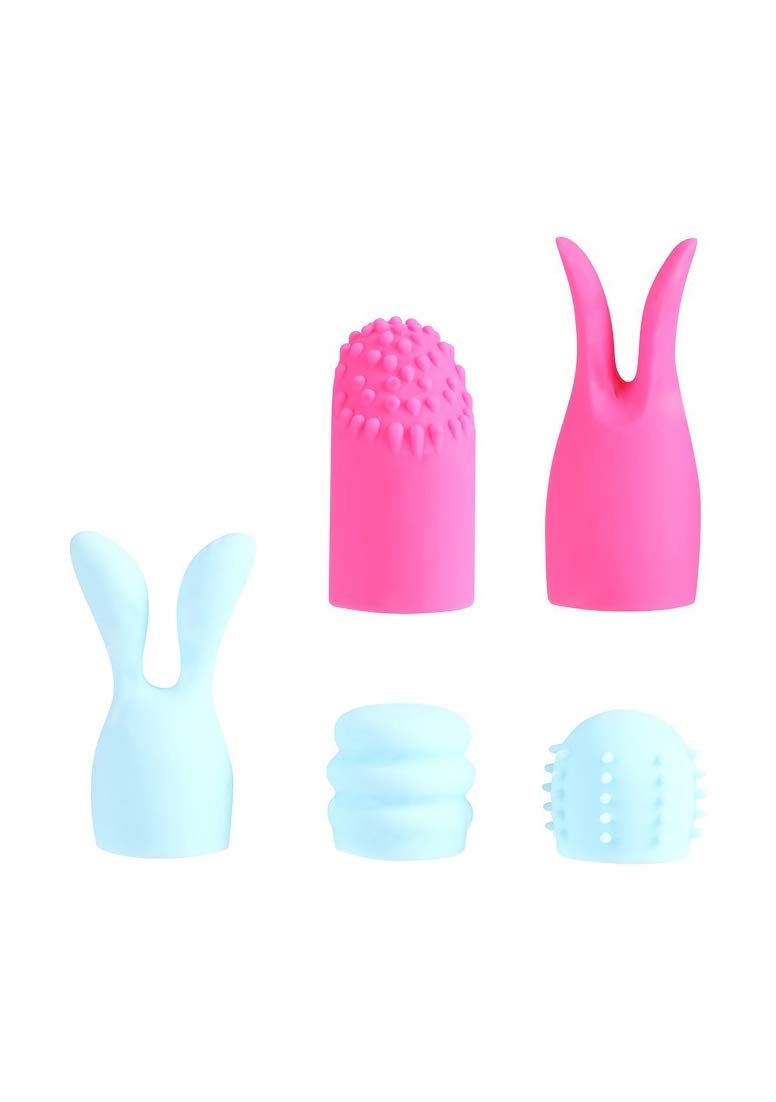 Q: What different shapes do the attachments come in?A: The set includes various shapes, such as a nubby pink vibrator sleeve, a pink sleeve with ears, a rabbit-style blue sleeve, and ribbed blue and standard attachments.