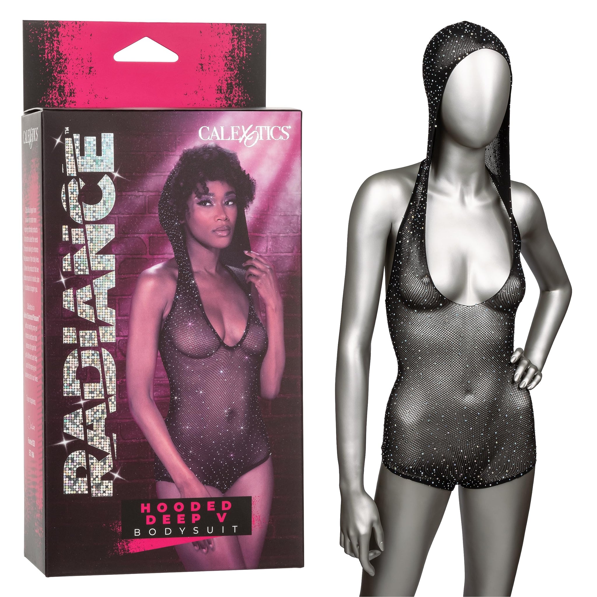Q: What makes the CalExotics Radiance bodysuit unique?A: Its combination of a unique hooded design, plunging neckline, and rhinestone accents sets it apart, offering both style and comfort.