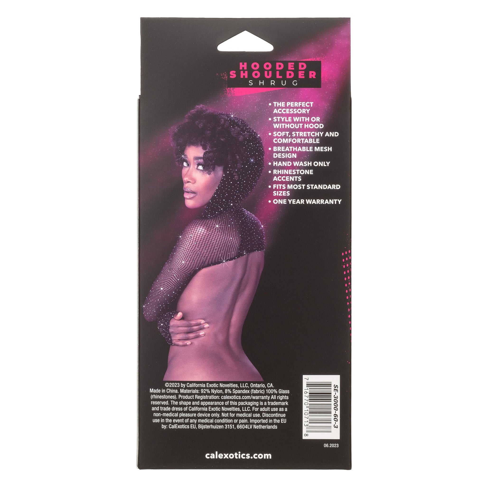 Radiance Hooded Shoulder Shrug O/S Black from California Exotic Novelties. Enhance your allure and captivate attention with the Radiance Hooded Shoulder Shrug. This sensual and seductive accessory adds an air of mystery and elegance to any ensemble, making it the perfect addition to your intimate wardrobe. Style it with or without the hood for even more fun and versatility. Crafted from soft, stretchy, and comfortable materials, this hooded shoulder shrug feels luxurious against your skin. The breathable mesh design allows for optimal comfort and ensures that you stay cool and confident throughout wear. Adorned with dazzling rhinestone accents, this shrug sparkles and shimmers, adding a touch of glamour and allure to your look. The rhinestones catch the light, drawing attention right where you want it. With its universal fit, this hooded shoulder shrug is designed to accommodate most standard sizes, ensuring a comfortable and flattering fit for a range of body types. To preserve its exquisite quality, it is recommended to hand wash it with care. Complete your sensual ensemble and embrace your radiant beauty with the alluring and captivating Radiance Hooded Shoulder Shrug. Whether for a special occasion or an intimate rendezvous, this accessory is sure to make you feel confident, sexy, and utterly irresistible. Specifications: SKU SE-3000-60-3. Color Black. 1 Year Warranty. Features: Wearable, Phthalate free. Material type:92% Nylon, 8% Spandex Fabric. 100% Glass Rhinestones. Bulk weight 1.7 ounces. Package with Shrug inside 3 ounces. Package: 2 inches by 4 inches by 8.5 inches. Categories: Lingerie, Clothing, Sexy Costume Accessories, Bondage, Fetish, Kink, Naughty Role Play, Hoods and Goggles. 2024.