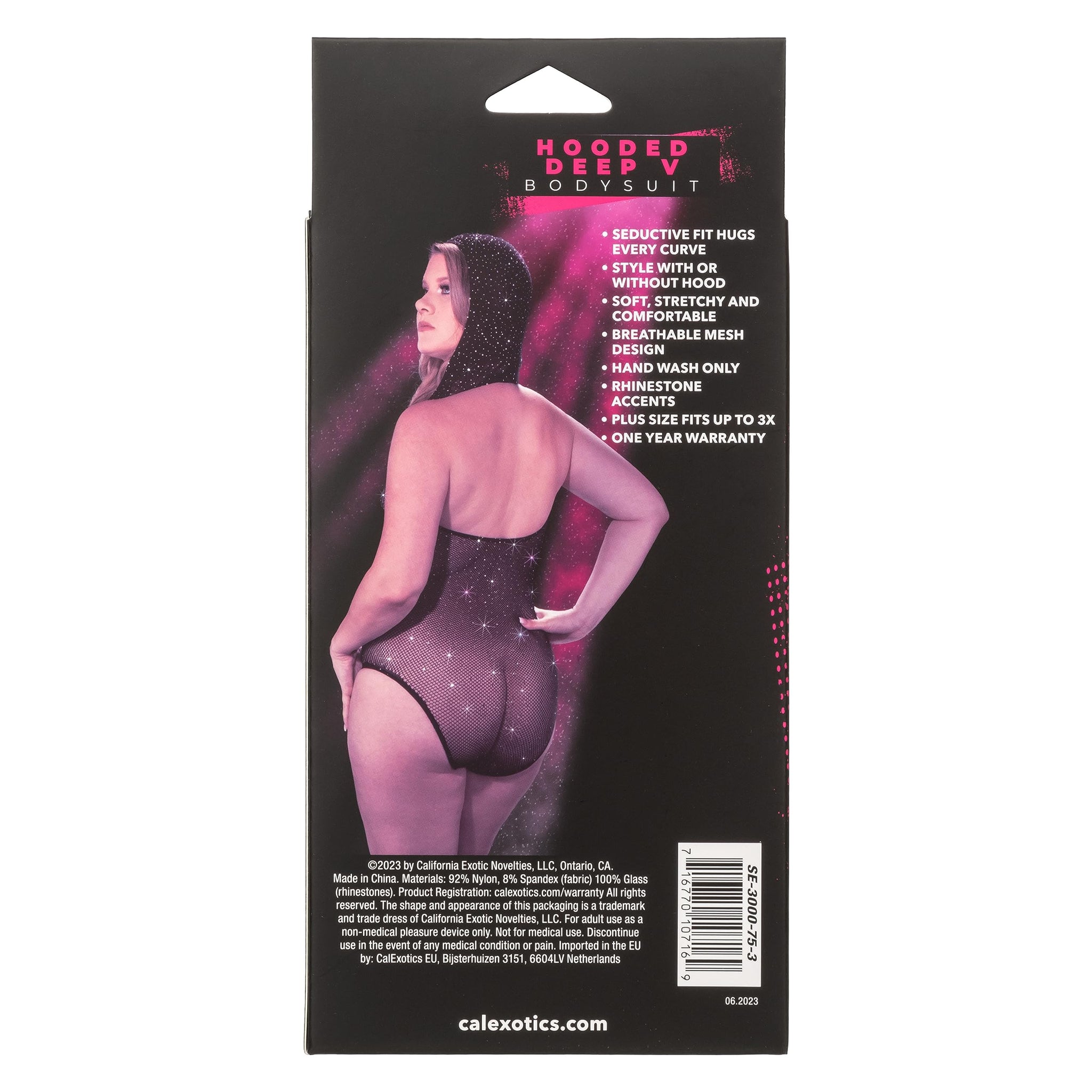 Radiance Plus Size Hooded Deep V Body Suit from California Exotic Novelties. Make a bold statement with the Radiance Plus Size Hooded Deep V Body Suit. This captivating body suit features a seductive plunging neckline and a mesmerizing hooded design, exuding confidence and allure. Style it with or without the hood for even more fun and versatility. Crafted from soft and stretchy materials, this body suit offers exceptional comfort and a flattering fit. The breathable mesh design enhances breathability, keeping you cool and comfortable during wear. The hooded body suit is adorned with dazzling rhinestone accents, adding a touch of glamour and sparkle to your look. The rhinestones catch the light, enhancing your natural beauty and creating an eye catching effect. With its stretchy fit and plus size design, the body suit fits sizes up to 3X. It embraces and celebrates your curves, allowing you to feel confident and empowered. To maintain the exquisite quality of this garment, it is recommended to hand wash it with care. Embrace your curves and unleash your inner radiance with the Radiance Plus Size Hooded Deep V Body Suit. Whether for intimate moments or to make a statement in your outfit, this hooded body suit is a perfect choice for those who want to feel confident, comfortable, and utterly captivating. Specifications: SKU SE-3000-75-3. Color Black. 1 Year Warranty. Features: Wearable, Phthalate free. Material type:92% Nylon, 8% Spandex Fabric. 100% Glass rhinestones. Bulk weight:12 ounces. Package 16 ounces. Package: 2 inches by 4 inches by 8.5 inches. Categories: Lingerie, Clothing, Plus Sizes, Sexy Costume Accessories, Bondage, Fetish, Kink, Naughty Role Play, Plus Sizes. 2024.