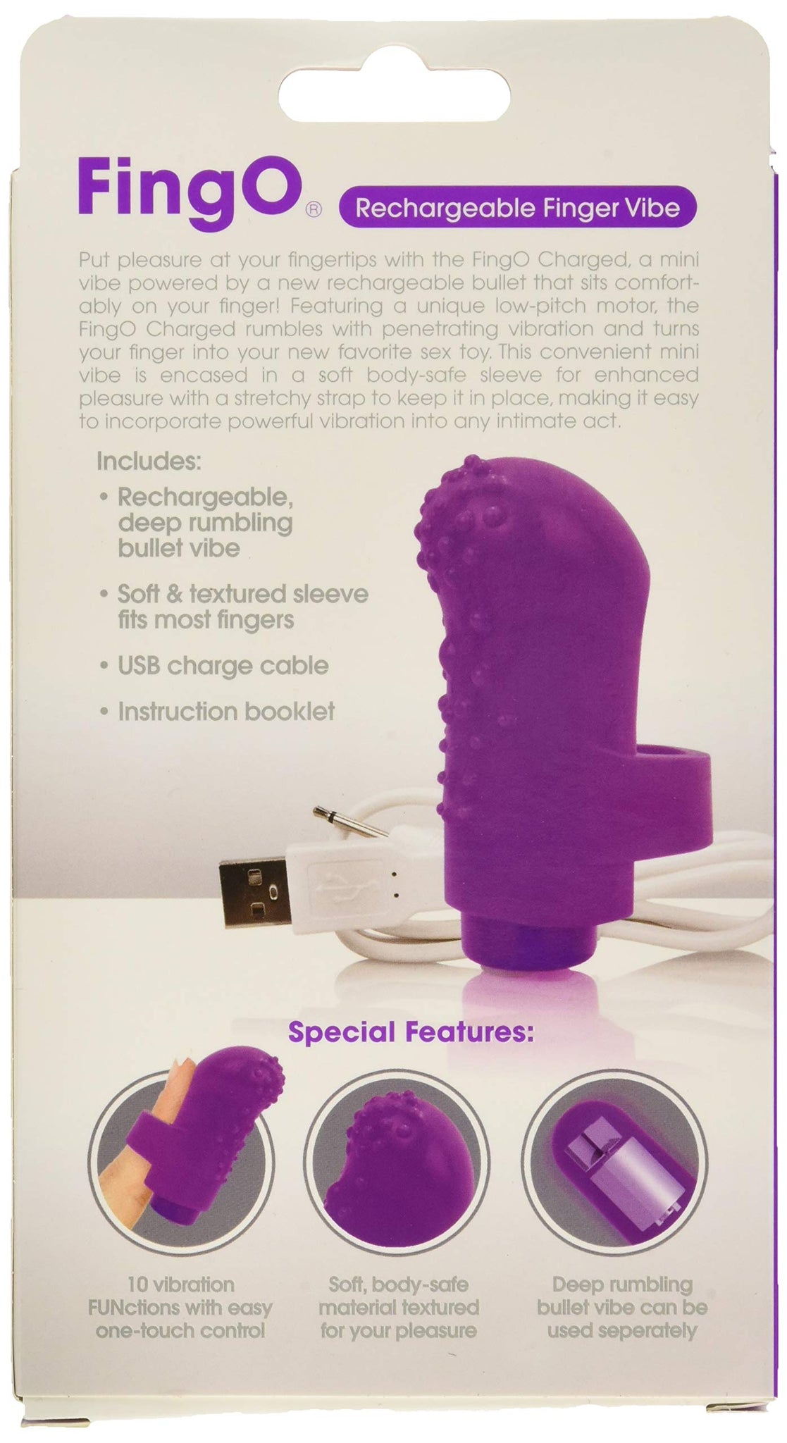 Screaming O Charged Fing O Vooom Mini Vibe Purple. Put pleasure at your fingertips with the Charged Fing O, a mini vibe powered by famous Vooom vibration technology that sits comfortably on your finger! Featuring a unique low pitch motor, the Charged Fing