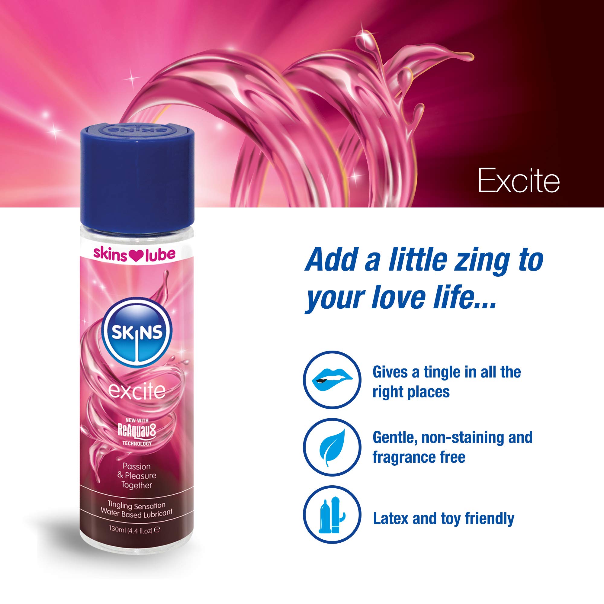 Skins Excite Tingling Sensation Passion and Pleasure Water Based Personal Lubricant 4.4 fluid ounces. Skins Excite, has all the fun and goodness of Skins Aqua lube but with added zing. Featuring L-Arginine it increases blood flow to the area where the lub