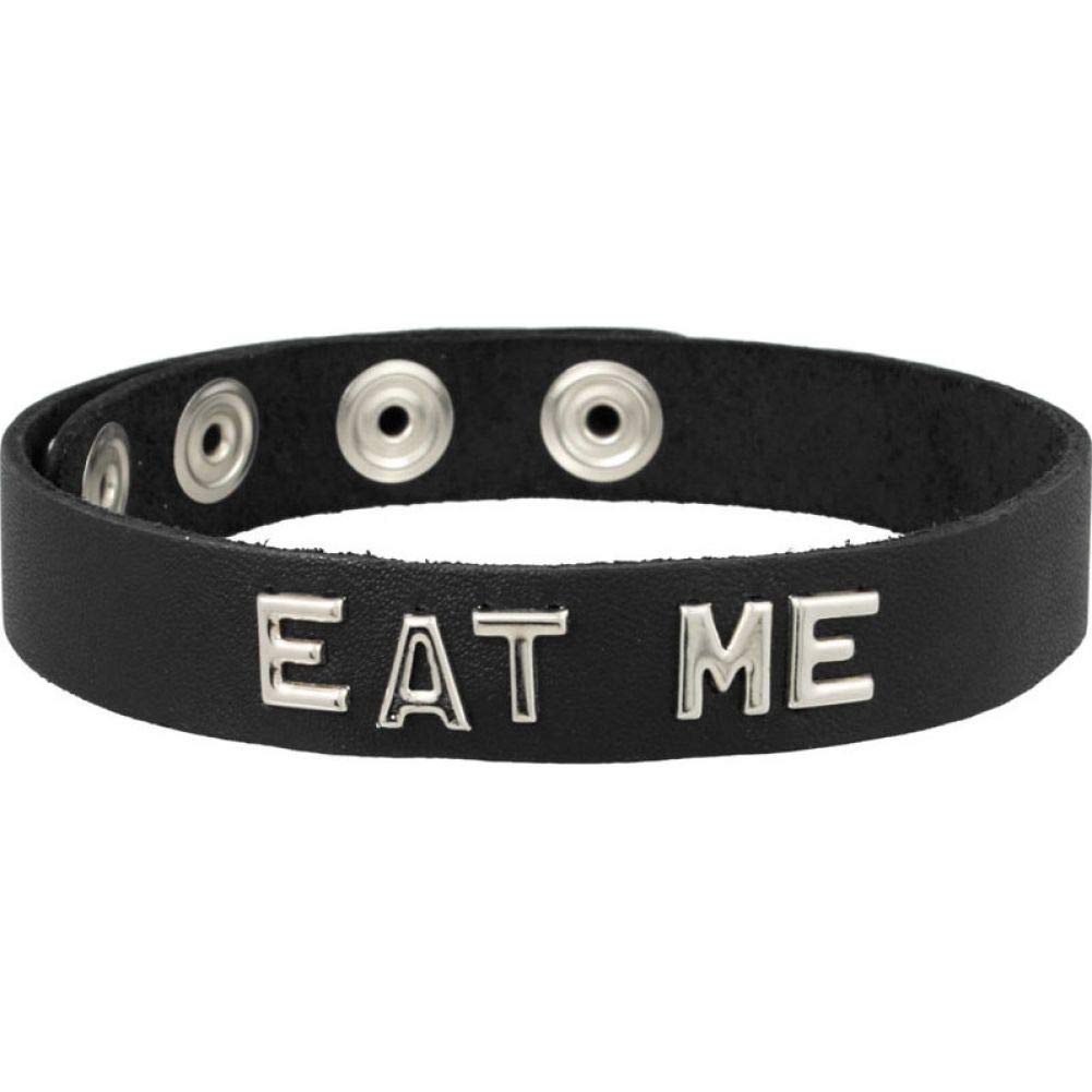 Leather Word Band Collar Eat Me from Spartacus Leathers. Choose a word band collar that suits you and your play! high quality oil tanned leather. .75 inch wide leather strap adjustable from 13.5 inches to 16.5 inches. Hand made in USA for over 30 years b