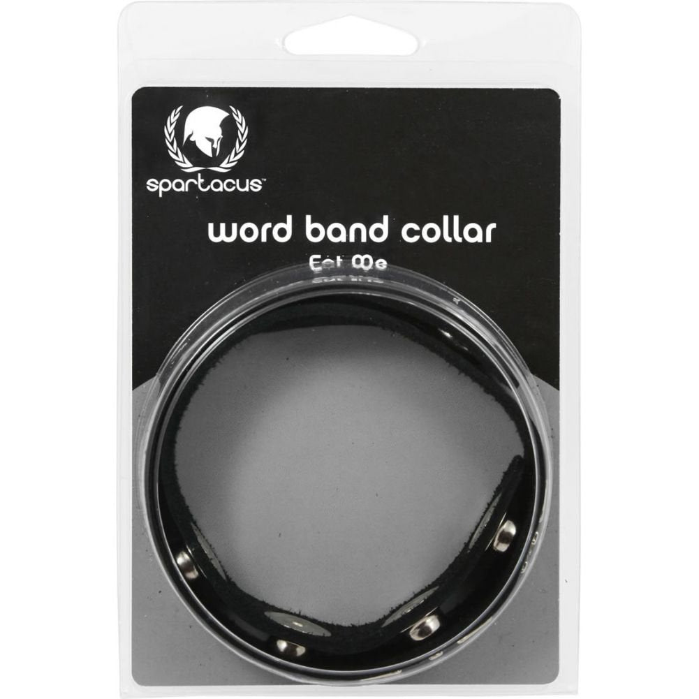 Q: Does the collar come in different colors or styles?A: Currently, the Spartacus Leathers Wordband Collar is available in specific designs, including the 'EAT ME' style. Please check the product listing for available options.