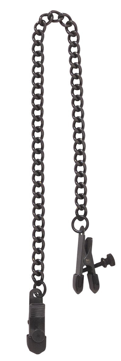 A: The Spartacus Blackline Adjustable Nipple Clamps feature adjustable wide alligator tips, which are ideal for larger nipples. They offer a gentler grip due to the rubber-tipped ends, yet can be tightened for a stronger hold. The clamps come with a black link chain, providing a classic fetish aesthetic.