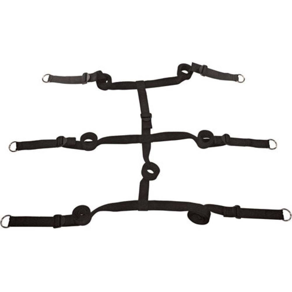 Edge Xtreme Under The Bed. The perfect bondage product. Includes 4 adjustable cuffs fits 4 inches to 12 inches wrists, 4 restraint straps secured to one connector strap that fits securely under your mattress. Restrains your partners arms and legs from the sides or bottom of the bed. Restraint strap quickly fits beneath any mattress with no hooks and adjusts to the size you desire. Easy setup on any mattress. Portable for a surprise getaway. Includes: 4 Wrist/Ankle cuffs, 4 60 inches restraint straps, 1 60 inches connector strap. Materials: polypropylene webbing, plastic hardware, nickel-free metal hardware Velboa fabric, hook and loop.