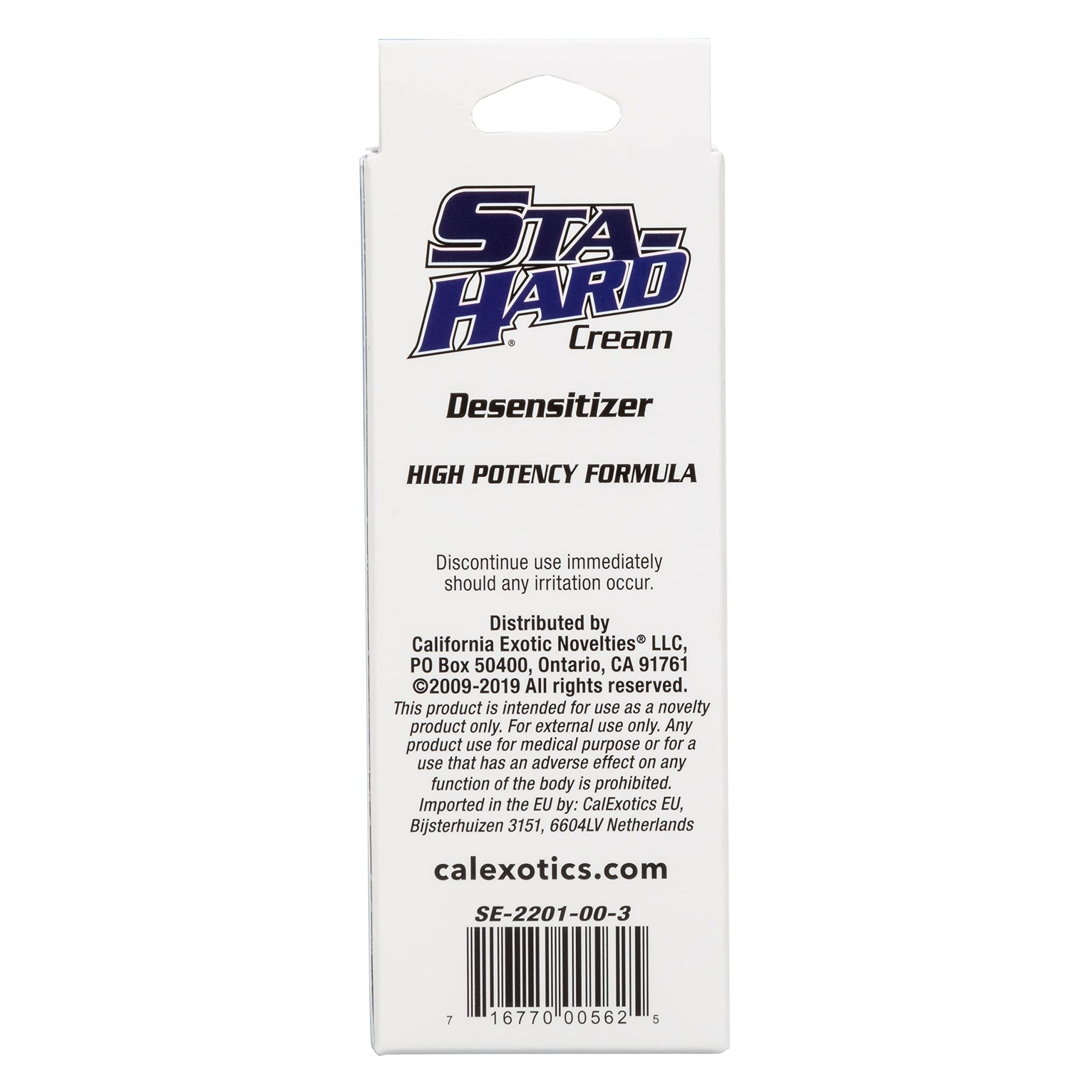 Make every moment count with the powerful Sta-Hard Cream. The high potency, unscented formula uses Benzocaine to desensitize and elevate pleasure, keeping you in the game longer. The high-potency Benzocaine keeps you going long and strong throughout foreplay and intercourse. Applied before playtime, the cooling lubricant works to elevate performance and pleasure with every use. Maximize your pleasure tool with every application and elevate performance, increase stamina and enhance pleasure for everyone involved. Indulge in hard and fast loving or take it slow as the desensitizing cream keeps you going longer. From bashful beginners to the erotically experienced, the unscented formula is gentle on sensitive skin. To use, simply apply from tip to base and enhance stamina, size and pleasure. The convenient, travel-size tube is handy in any moment of passion. Desensitizer Maximum Strength High Potency Formula Unscented 7.5% Benzocaine Made in the USA 59mL Desensitizing cream Unscented