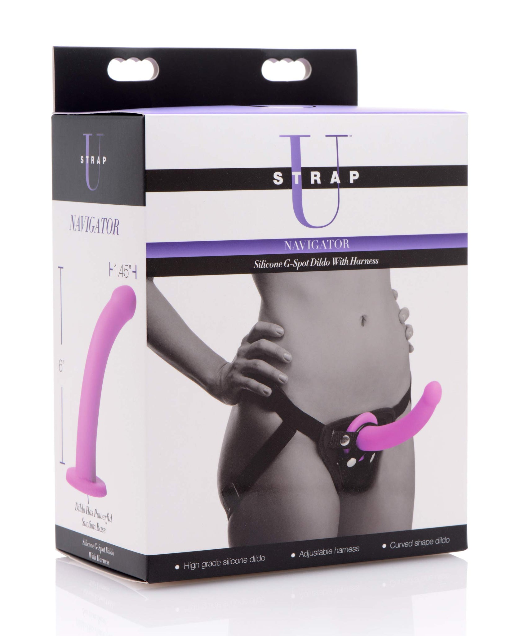 Q: What materials is the Strap U Navigator Silicone G-Spot Dildo made from?A: The dildo and harness are made from premium silicone, nylon, ABS plastic, and metal.
