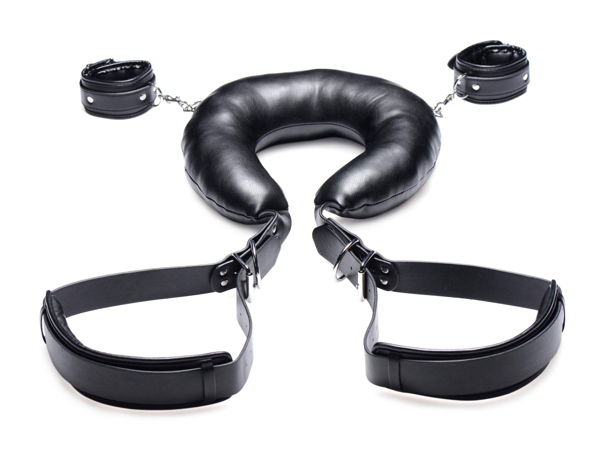 A: Key features include padded for comfort, deeper penetration, adjustable wrist cuffs and thigh straps, six attached D-rings, and padded neck support.