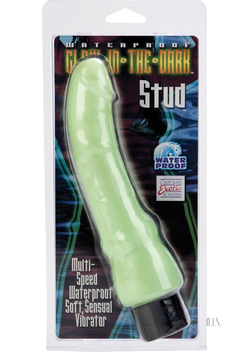 Waterproof Glow-In-The-Dark Stud Mint Vibrator is soft, multiple speeds penis vibrator. Safe and pure for body and pleasure. Made using phthalate free, non-toxic materials PVC shaft, ABS plastic cap. Vibrator measures 7.5 inches long by 1.75 inches wide.
